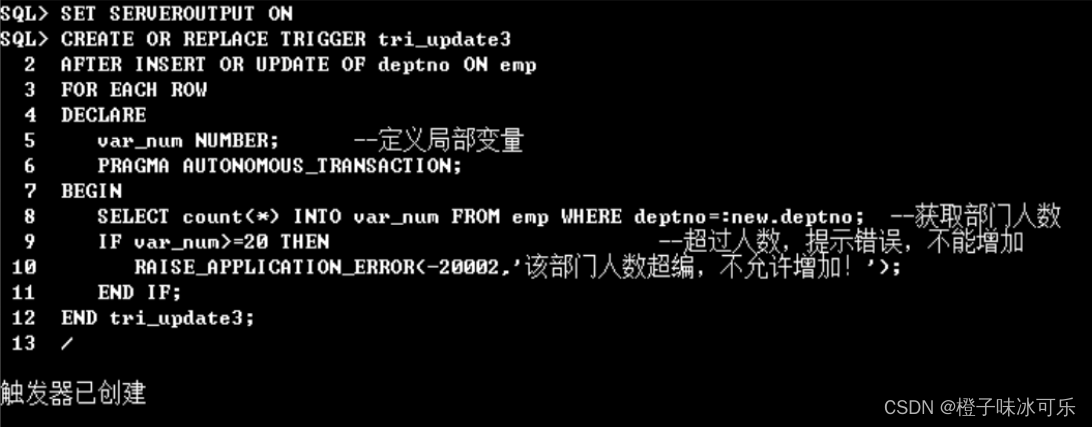 (3)在 emp 数据表上建立触发器,统计部门人数,当插入新员工的时候,统计是否部门员工人数超过上限。