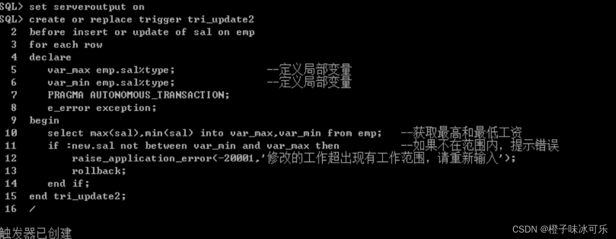 这个范例要求当员工工资改变的时候,核对是否超出全体员工工资允许的范围,如果超过范围,则提示错误,不能修改。触发器代码如下图所示。