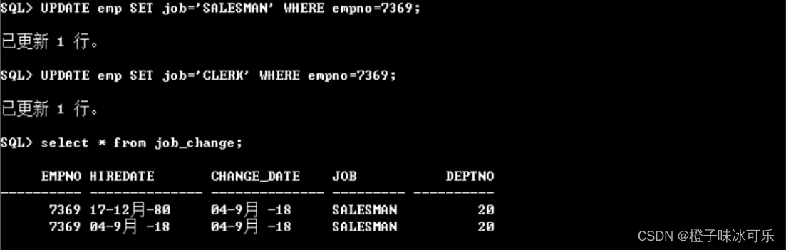 如上图所示,接连修改员工 7369 的工作岗位,可以看出职工变化信息表中记录了变化信息。