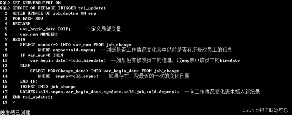 最后将变化信息插入job_change 数据表中:触发器创建的代码如下图所示。