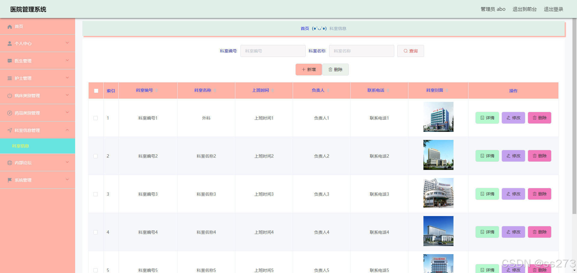 科室信息管理:对医院的各个科室信息进行管理,包括添加、修改、查询、删除等。