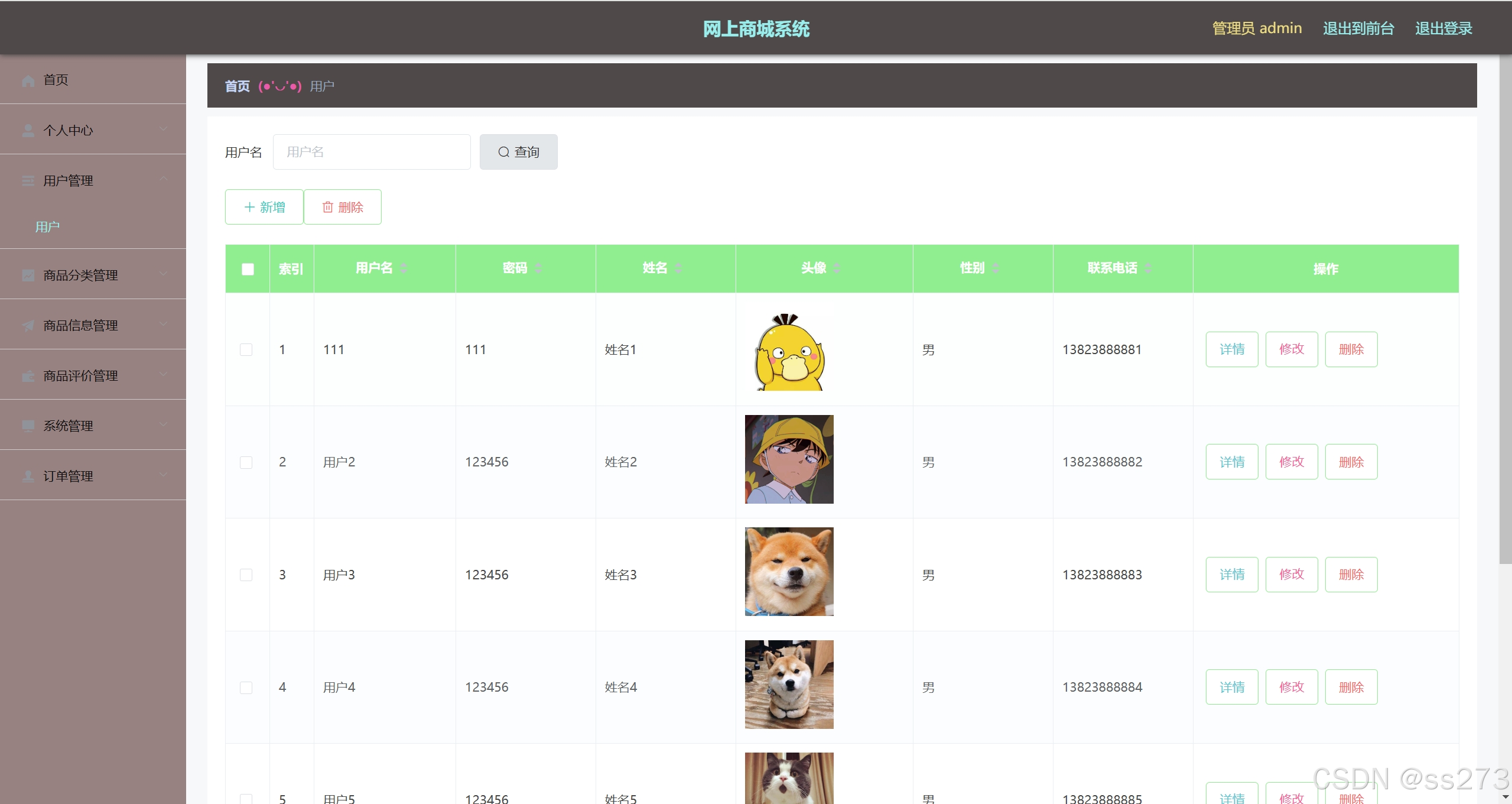 - 用户信息管理:管理员可以查看和编辑用户的个人信息,如用户名、密码、联系方式等。