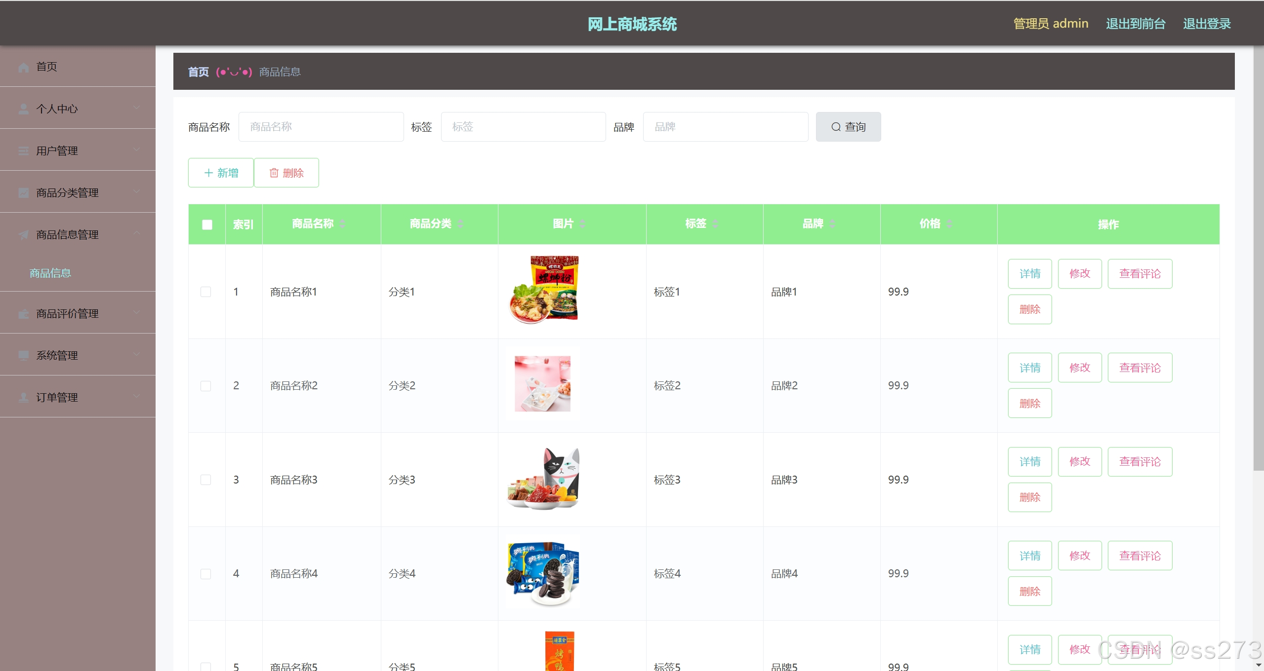 - 商品信息管理:管理员可以管理商品的基本信息,包括商品名称、价格、库存量等。管理员还可以添加和删除商品。