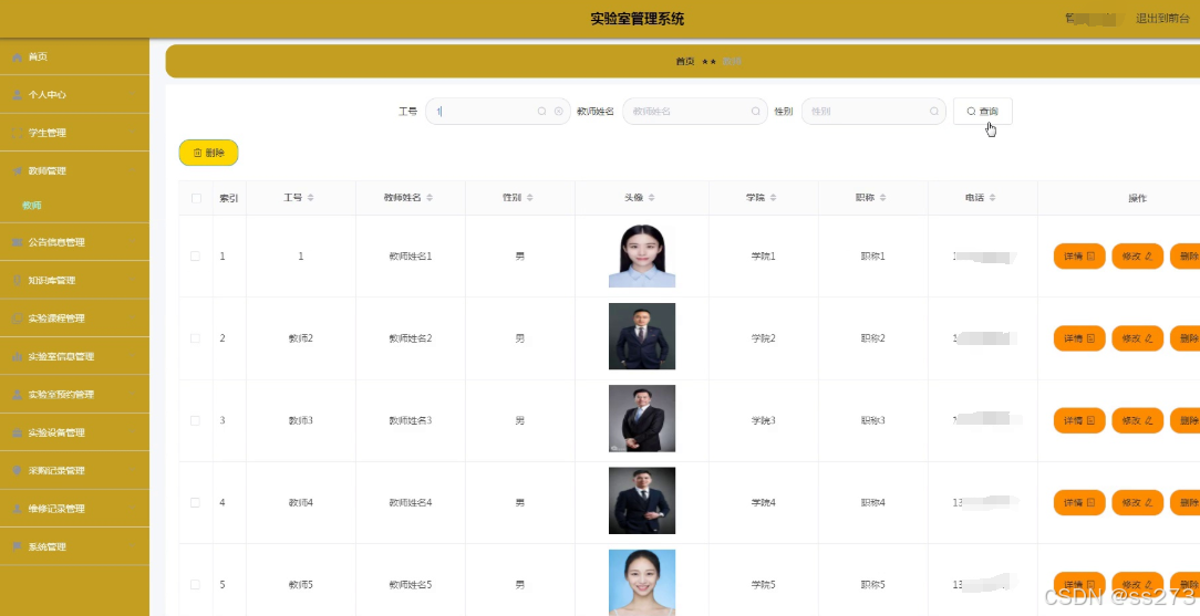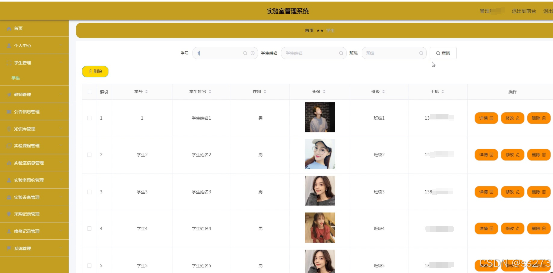管理员角色:个人中心管理、学生管理、教师管理、公告信息管理、知识库管理、实验课程管理、实验室信息管理、实验室预约管理、实验设备管理、采购记录管理、维修记录管理、系统管理。