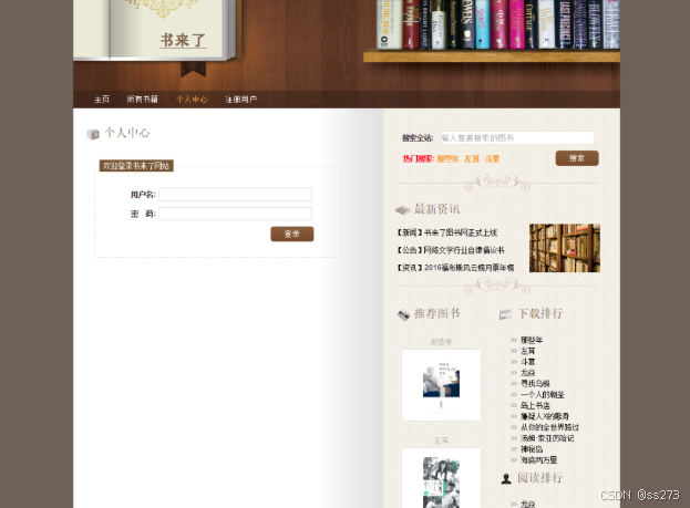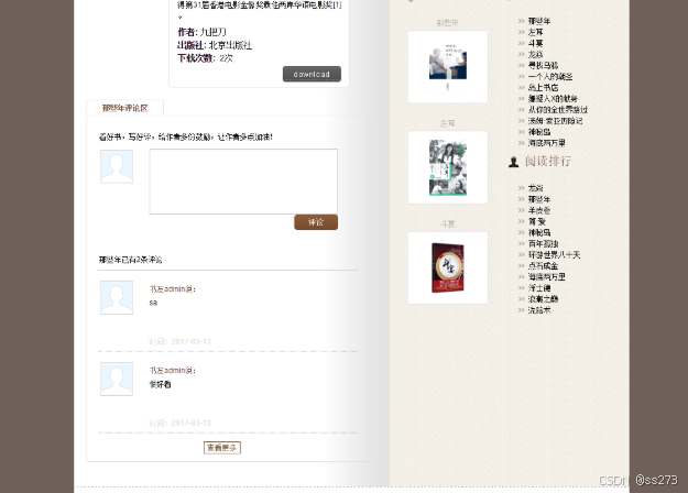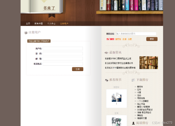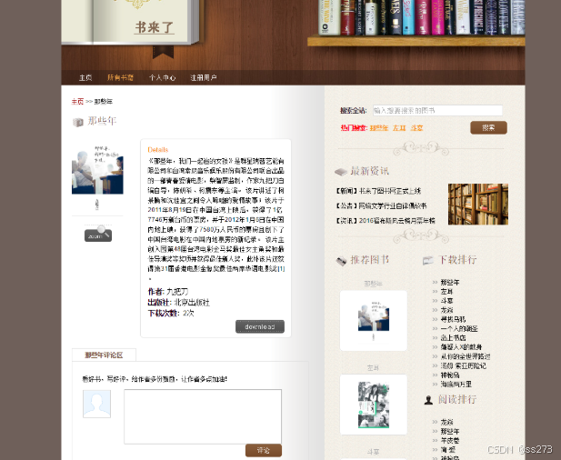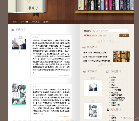 前台部分: 推荐图书、最新资讯、下载量排行、图书搜索、图书详情、图书下载、图书评论、个人中心、登录、注册等模块。