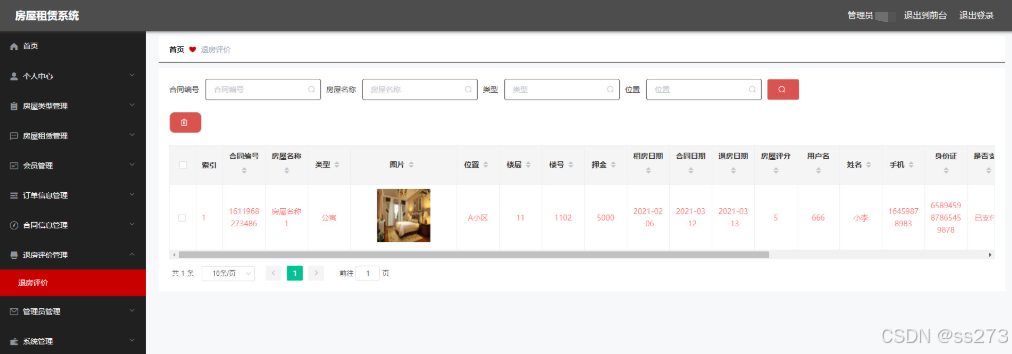 退房评价管理:在租客退房后进行房屋评价,结算相关费用。
