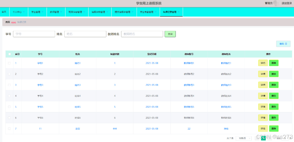 缺课记录管理功能:查看和管理学生的缺课情况。