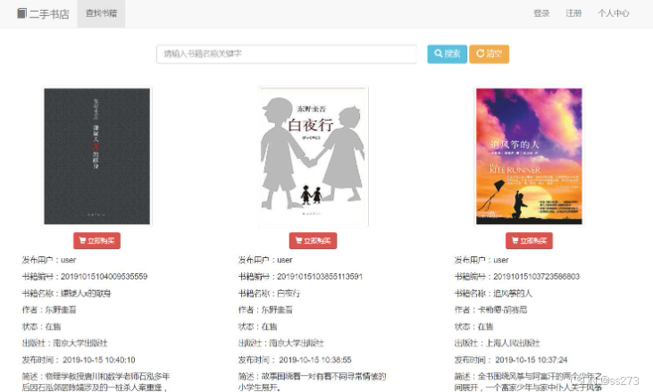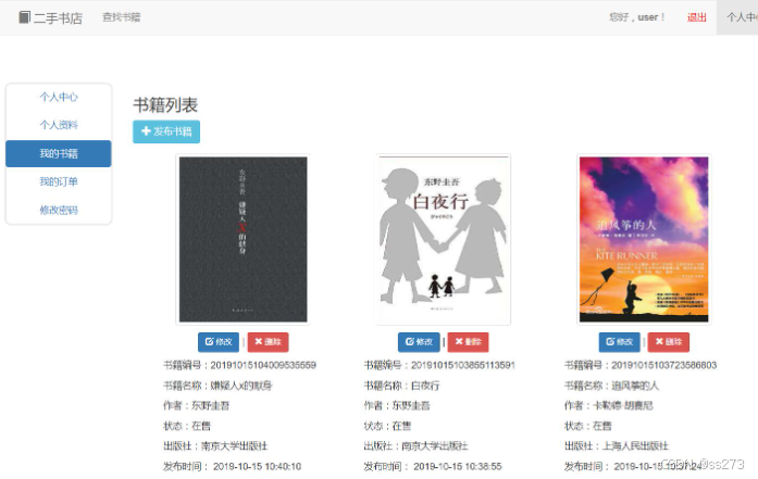 普通用户:书籍展示、查找书籍、登录、注册、购买书籍、个人中心、个人资料、我的书籍、发布二手书籍、我的订单、修改密码等。