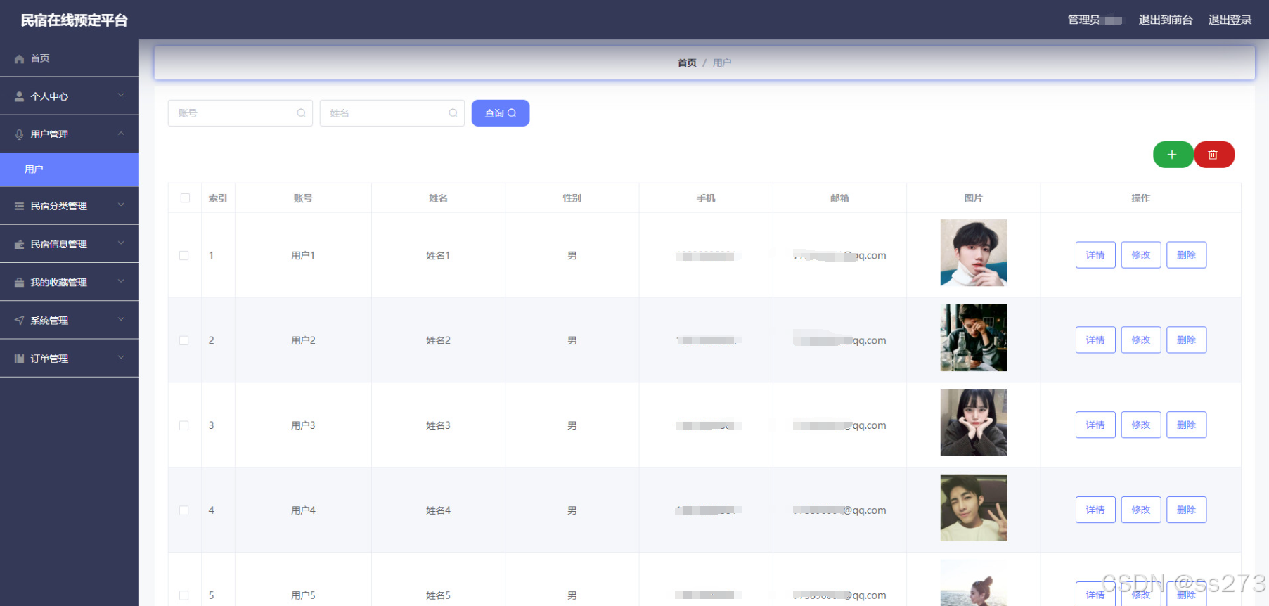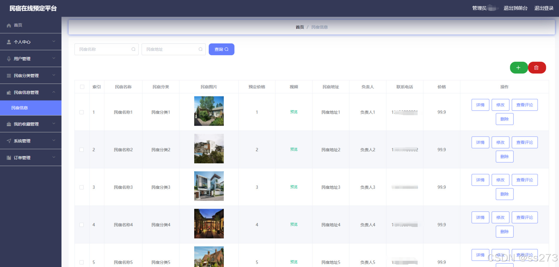 民宿信息管理:管理员可以对民宿信息进行添加、修改、删除以及查询操作。