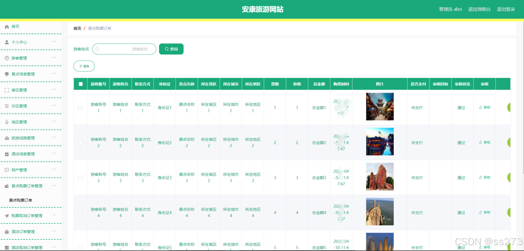 景点购票订单管理:管理员可以查看景点购票订单信息,并可对其进行审核、修改和删除操作。