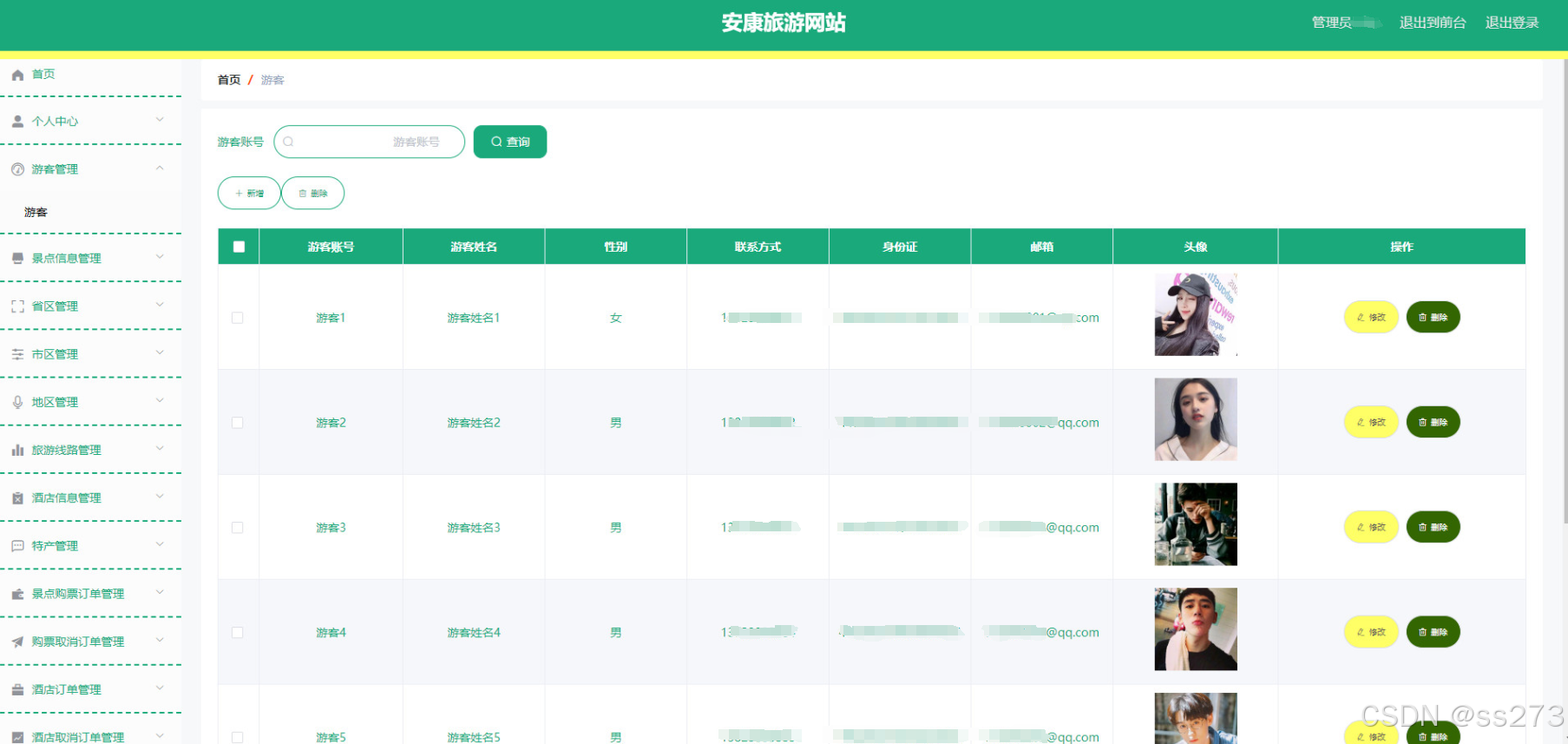 游客管理:管理员可以查看、添加、修改和删除游客信息。