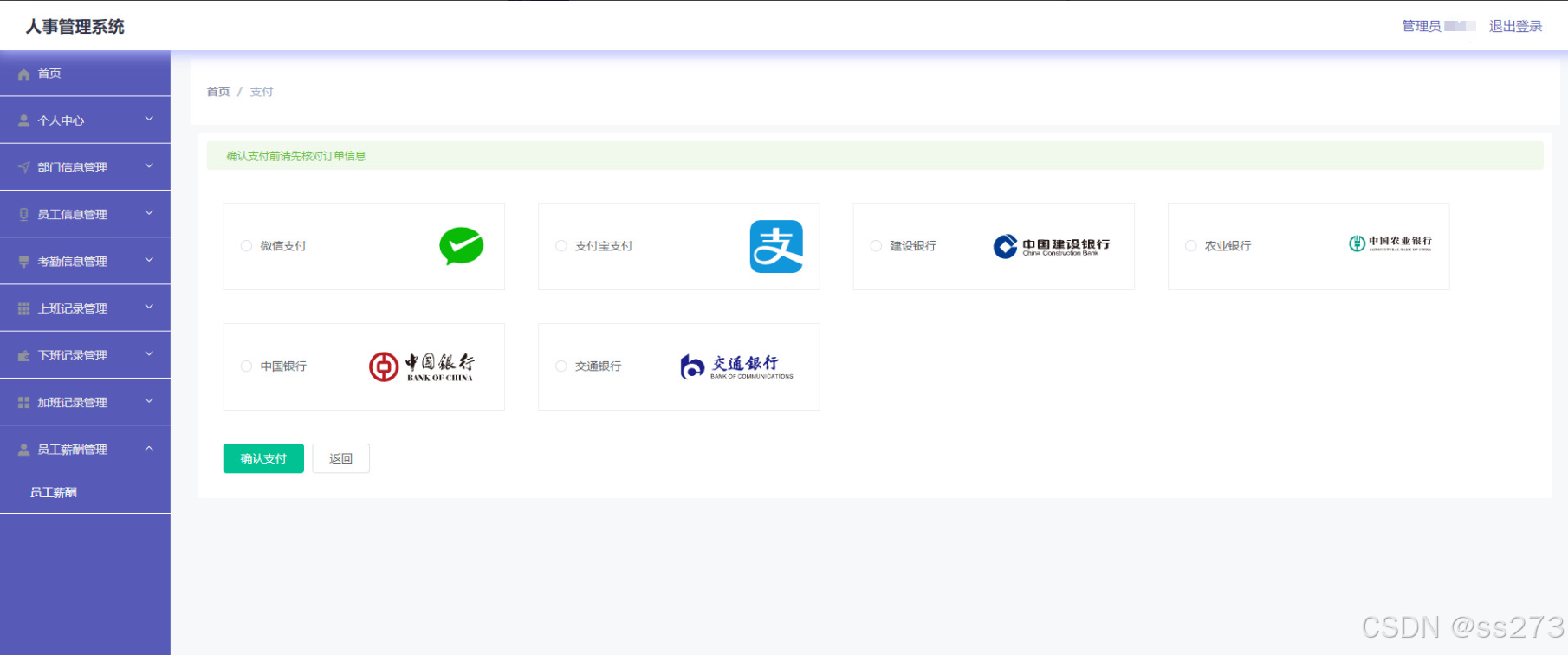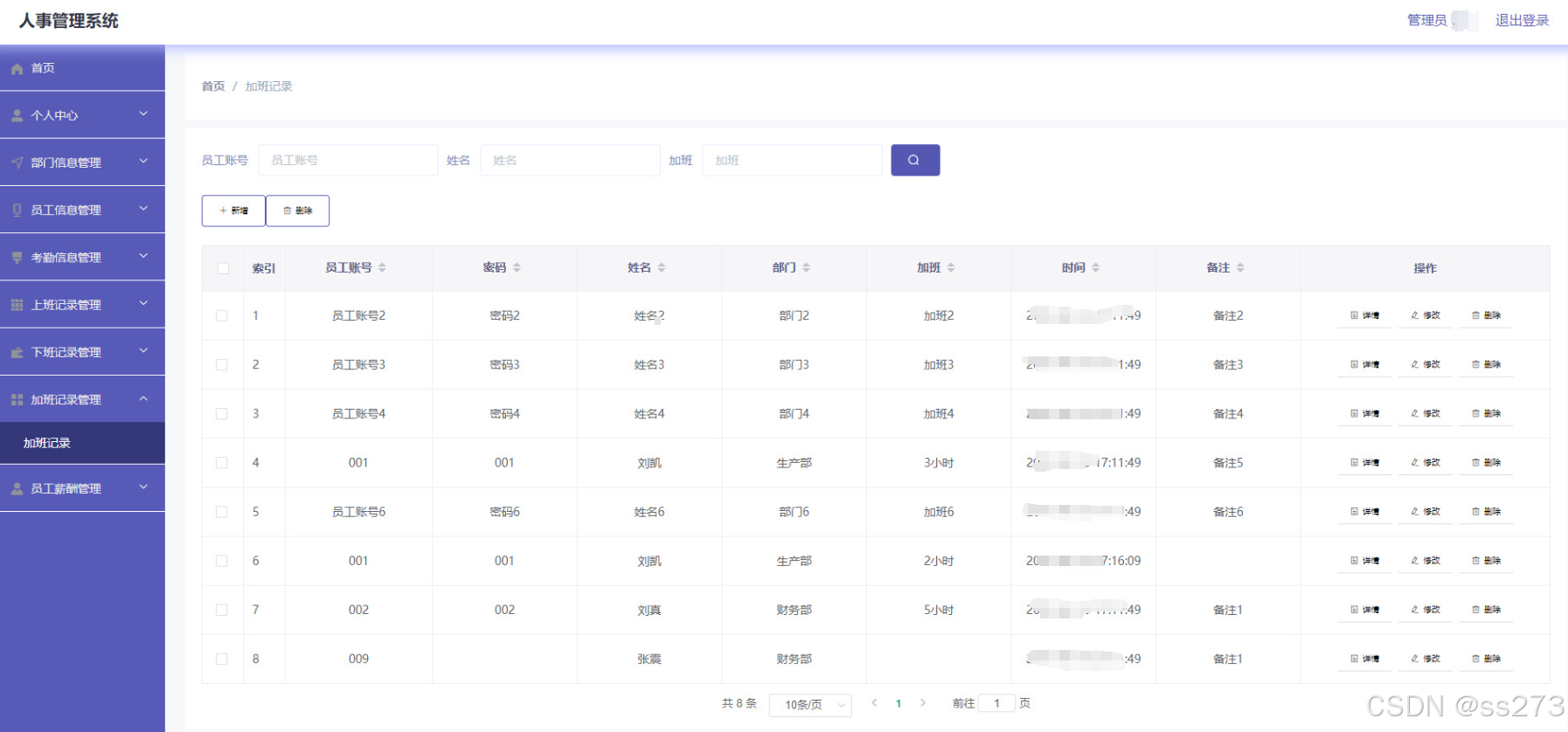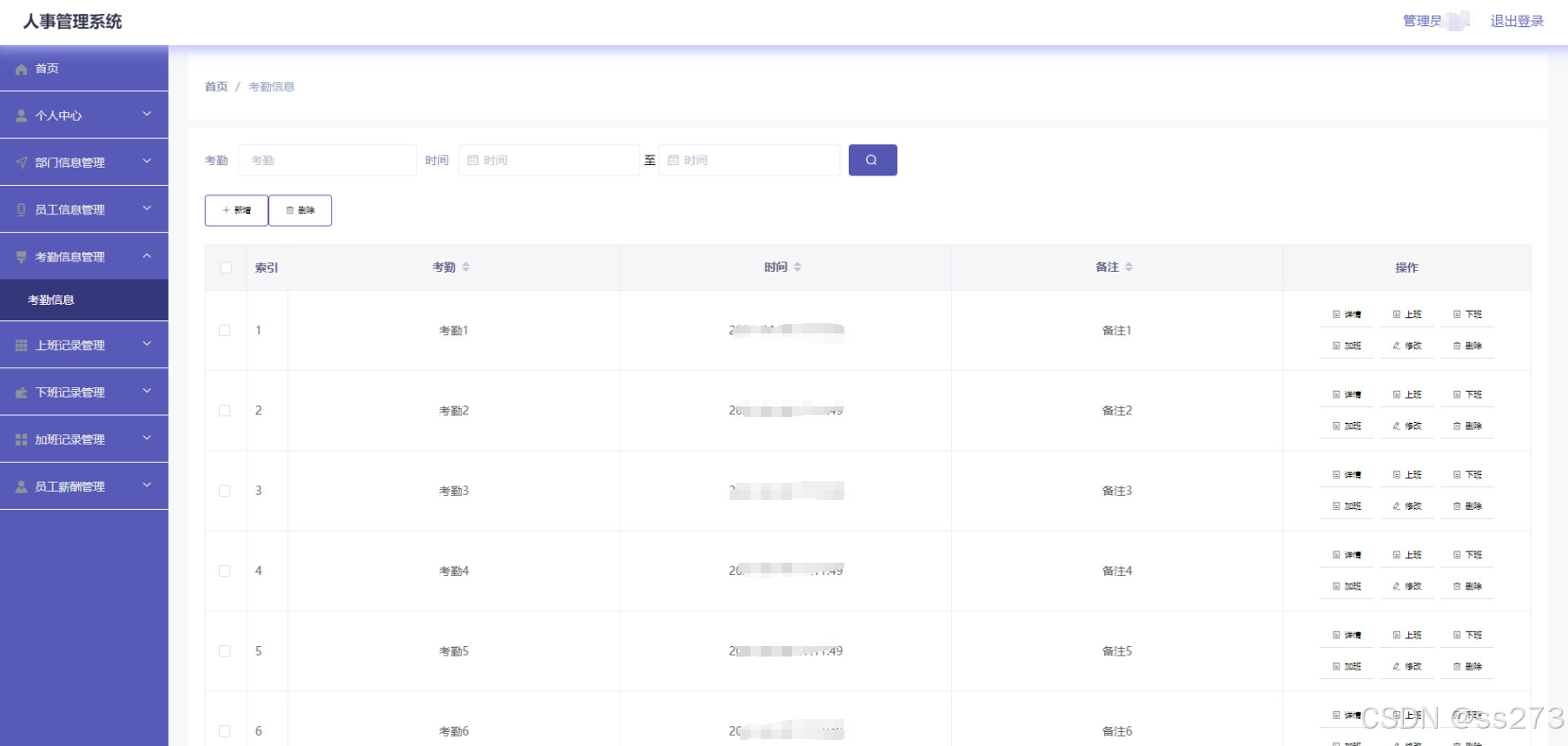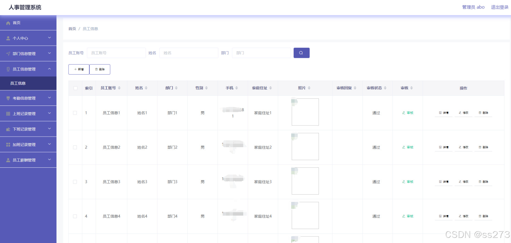 基于SpringBoot+Vue实现的人事管理系统采用前后端分流的架构方式,设计了管理员、员工两种角色,实现了员工管理、部门管理、员工请假管理、员工加班管理、员工工资管理、员工考勤管理、招聘信息管理、员工培训管理、员工详情管理等功能模块