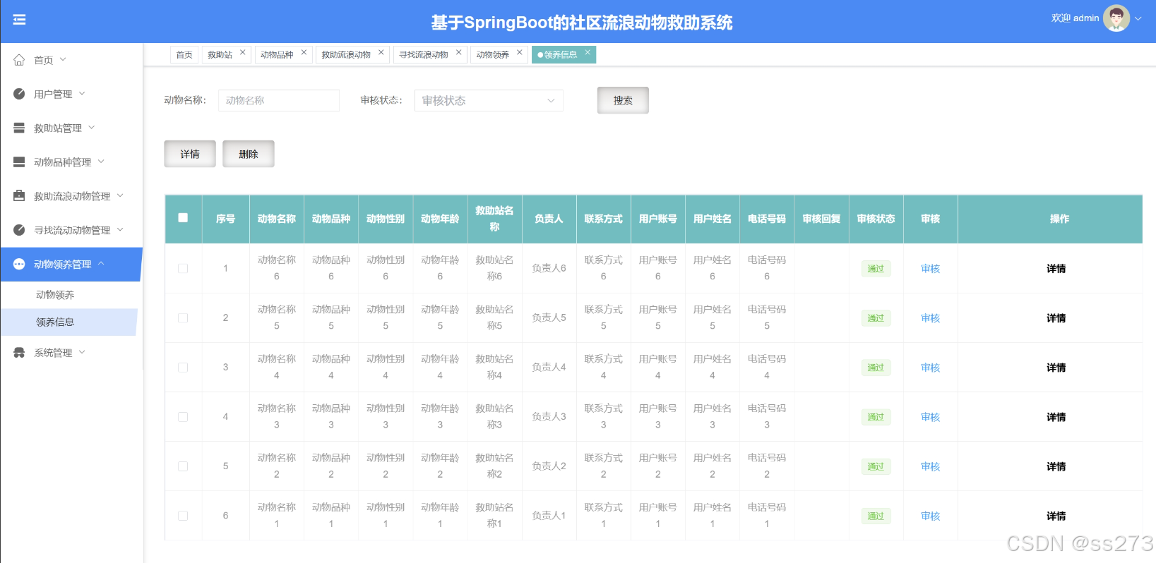 管理员:登录、用户管理、救助站管理、动物品种管理、救助流浪动物管理、寻找流浪动物管理、动物领养管理、系统管理等