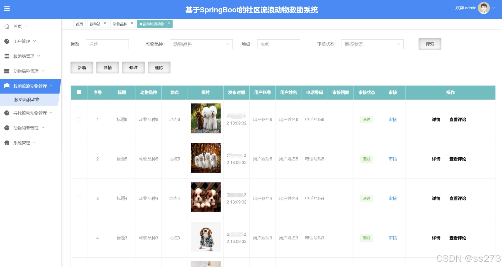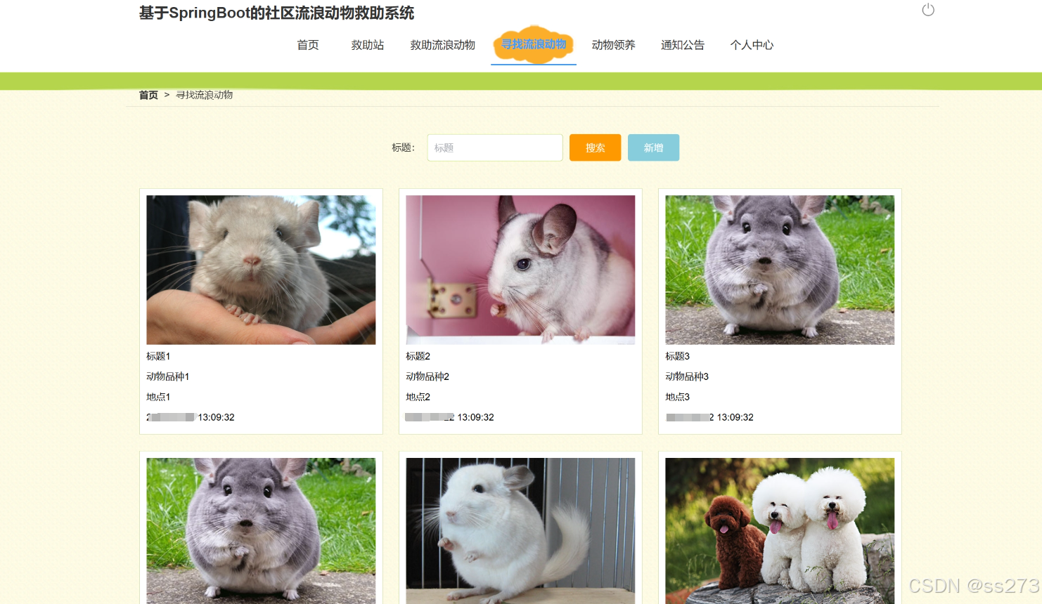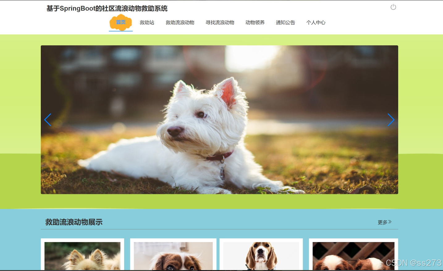 用户:登录、注册、前台首页、救助站展示、救助流浪动物、寻找流浪动物、动物领养、评论、通知公告、个人中心、修改密码等