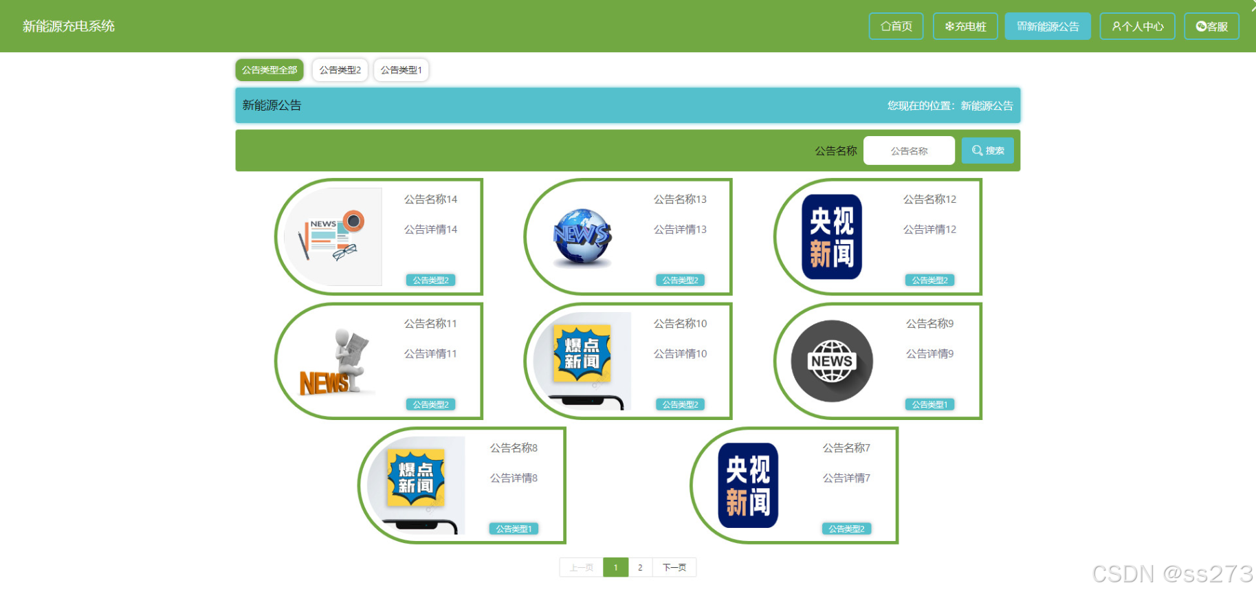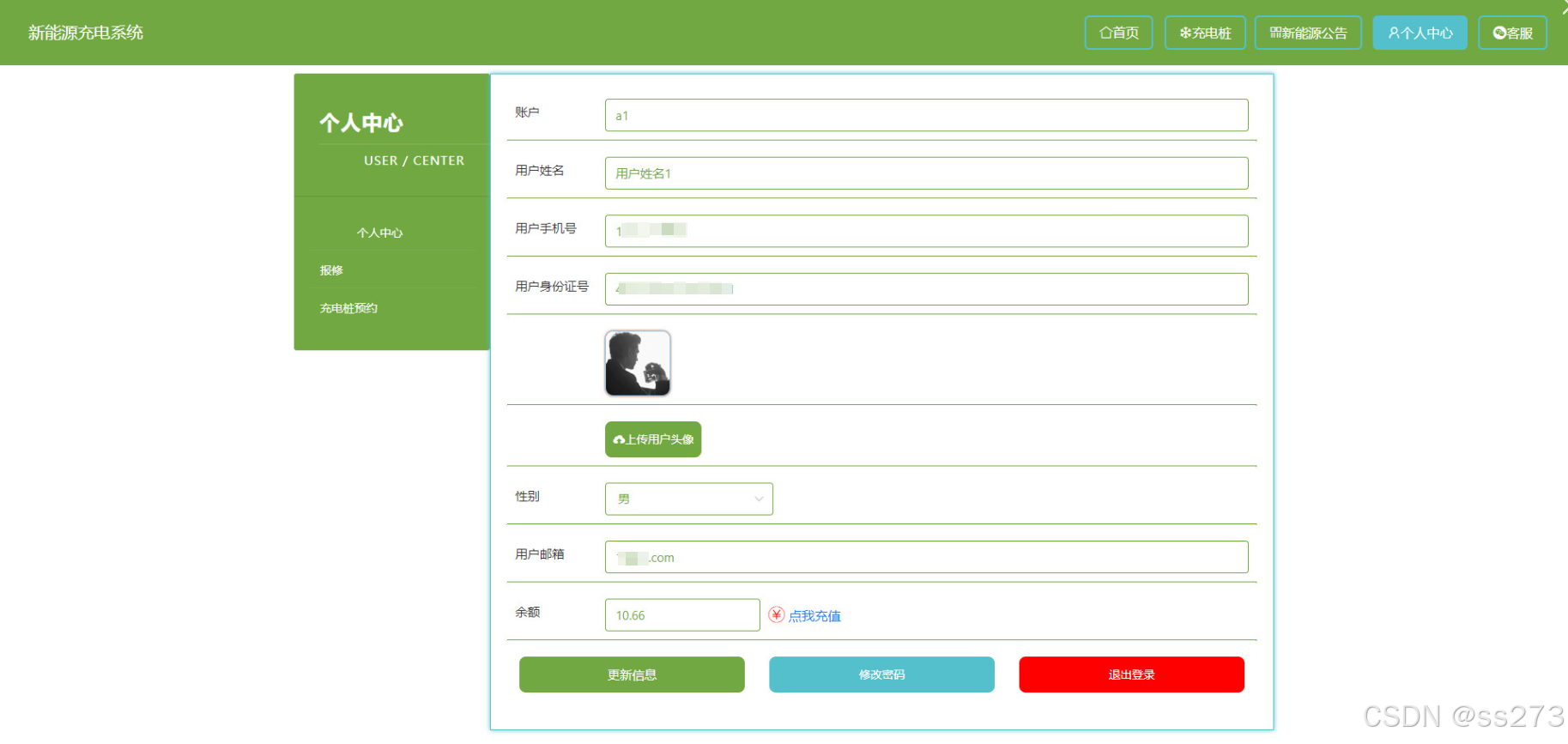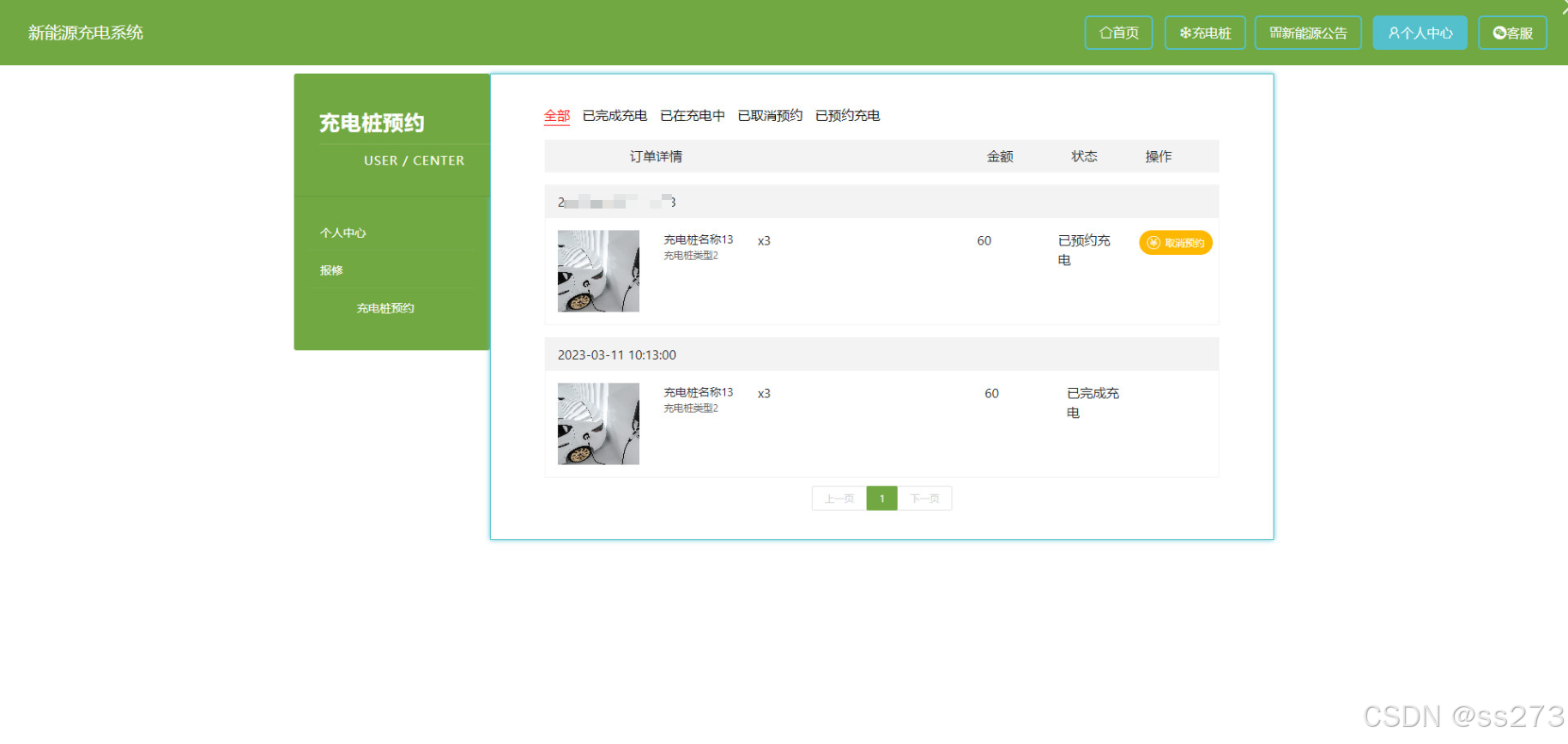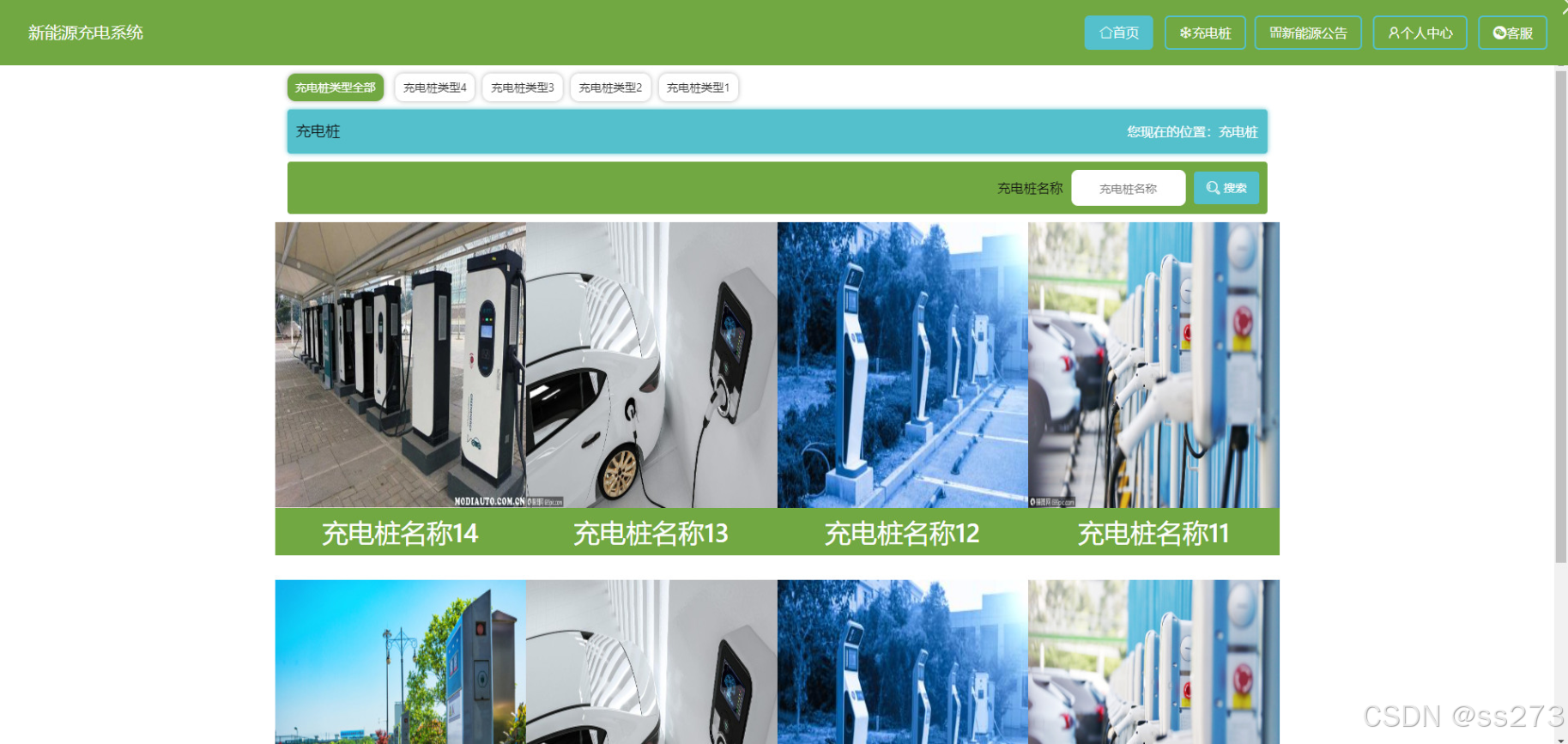 用户:登录、注册、充电桩展示、充电桩预约、充电桩报修、个人中心、新能源公告等