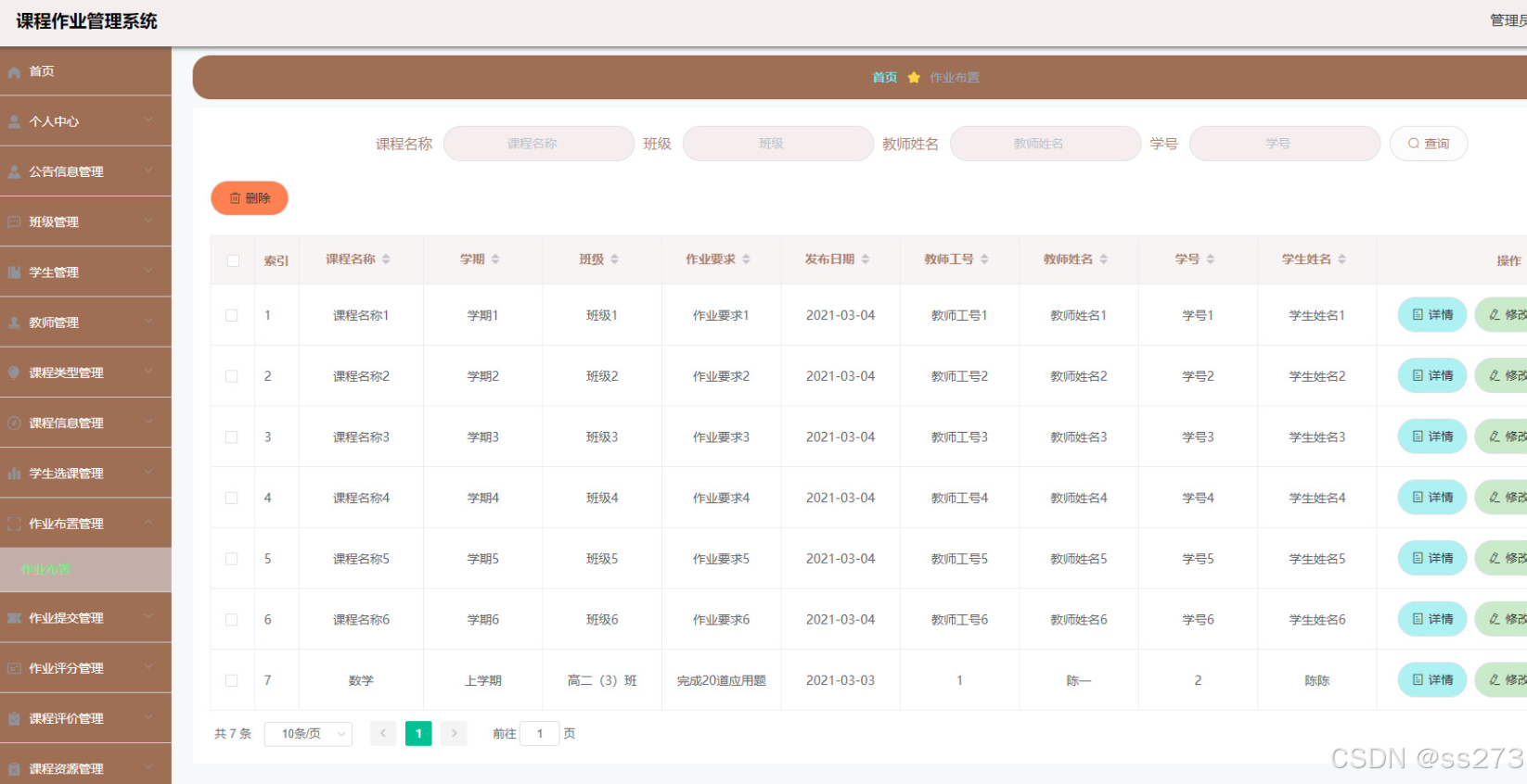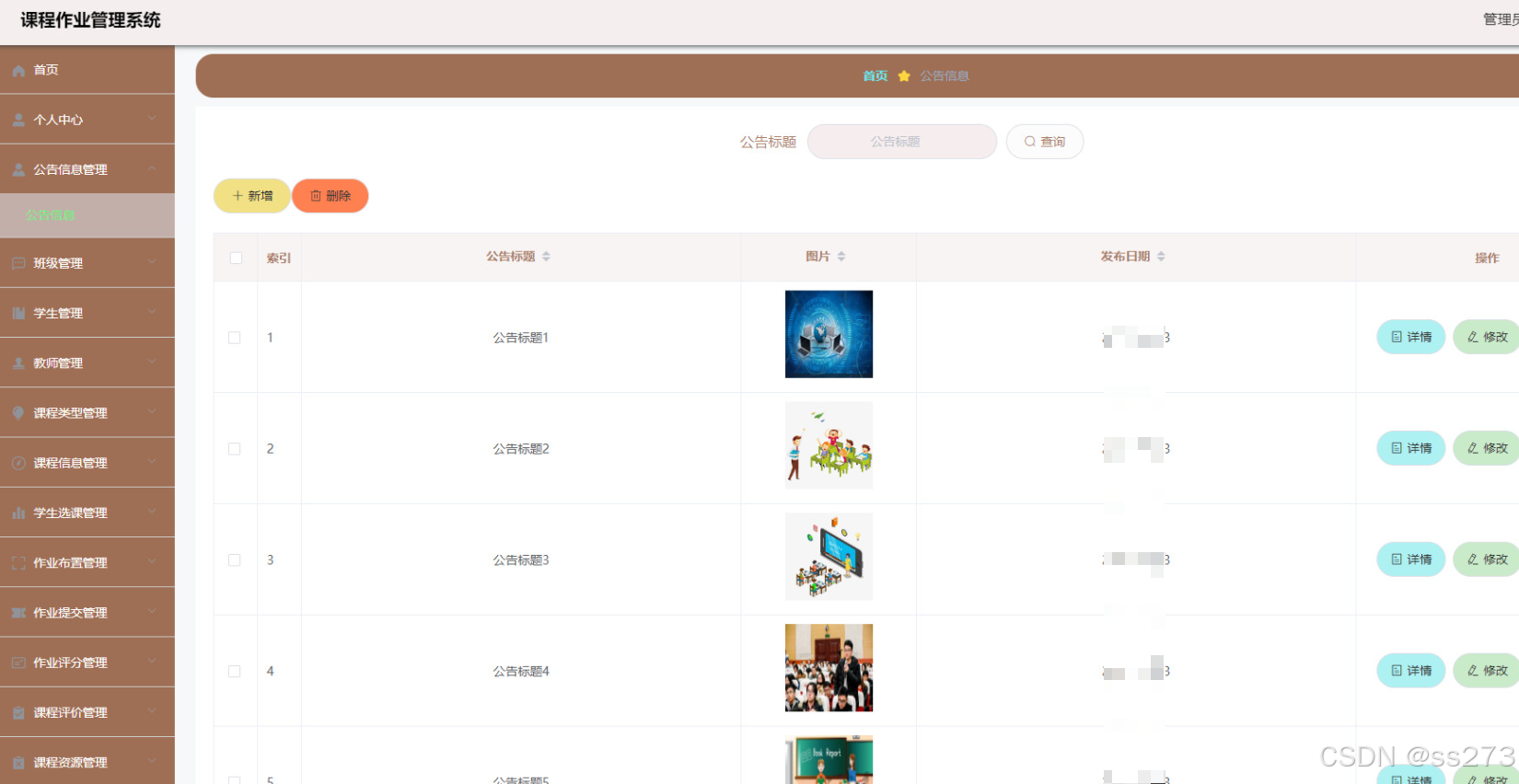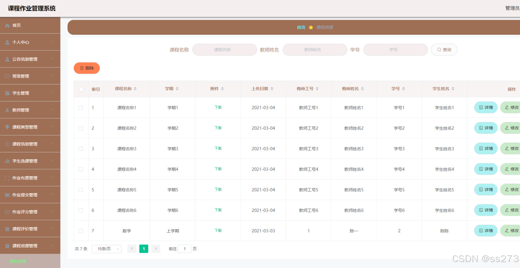 主要功能说明:项目描述系统功能包含登录、学生注册、个人中心、公告管理、学生管理、教师管理、课程管理、学生选课管理、作业布置、作业提交、作业评分管理、课程评价管理、课程资源管理等。