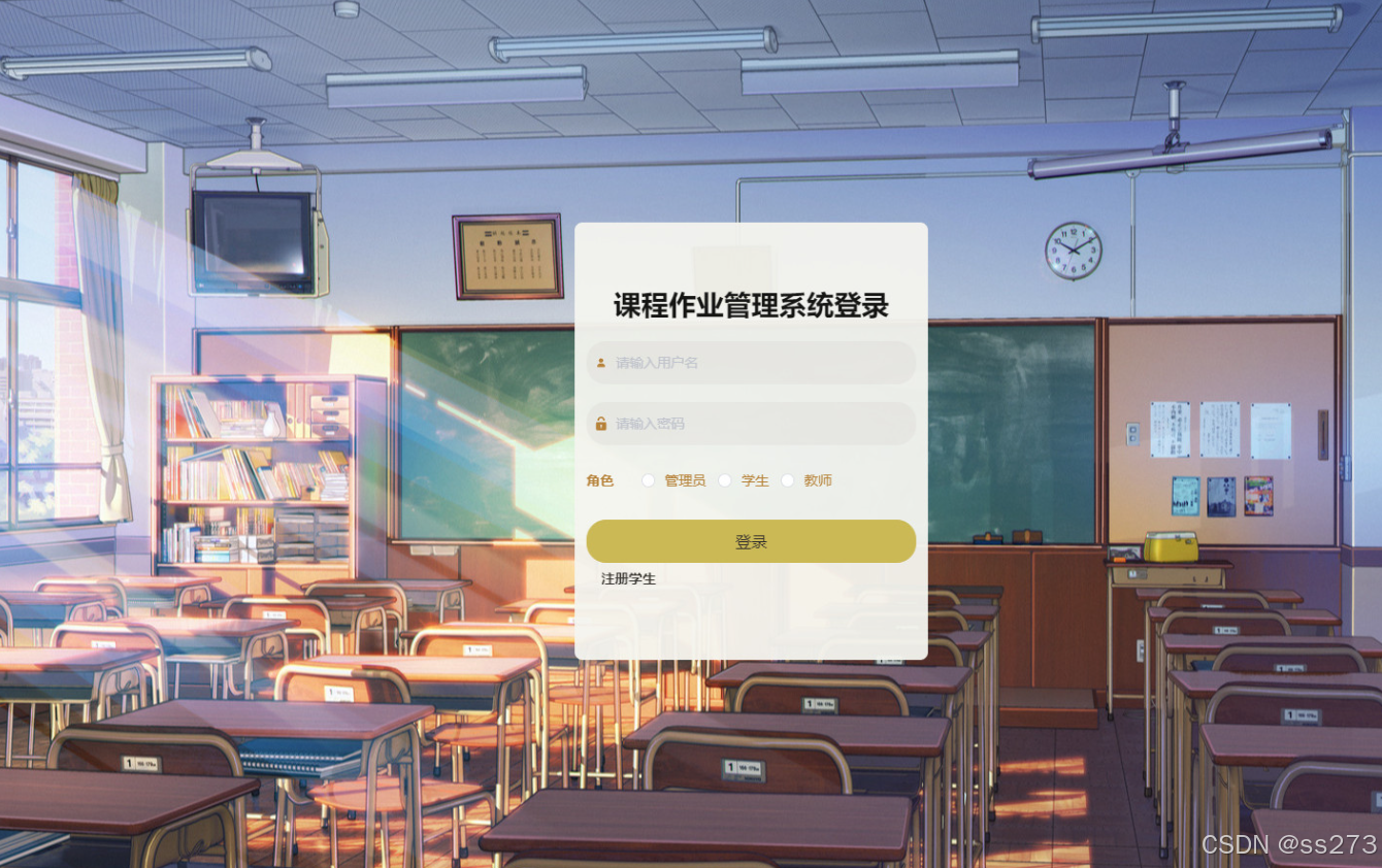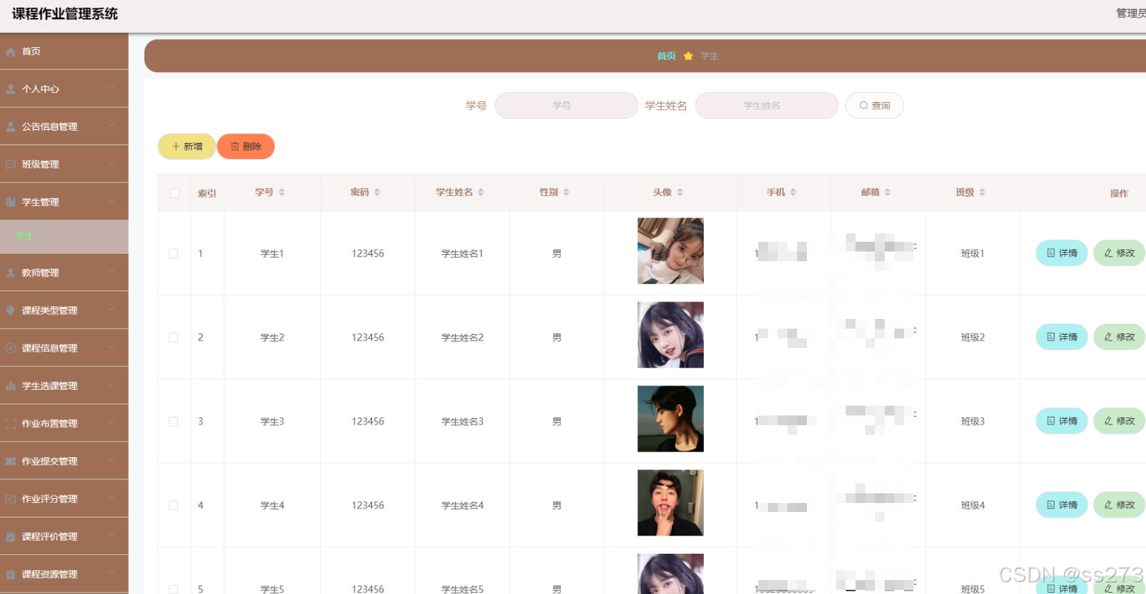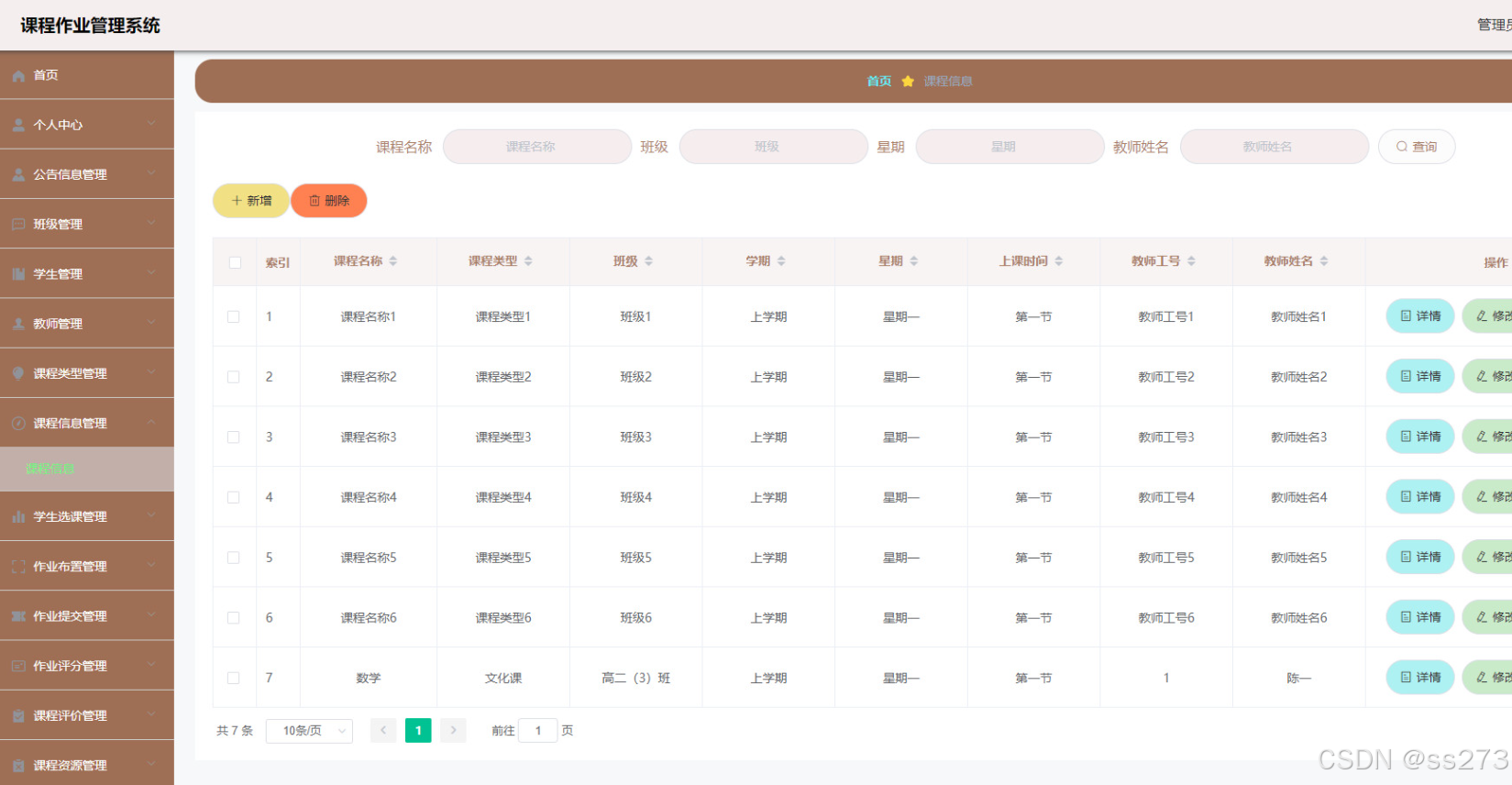 主要功能说明:项目描述系统功能包含登录、学生注册、个人中心、公告管理、学生管理、教师管理、课程管理、学生选课管理、作业布置、作业提交、作业评分管理、课程评价管理、课程资源管理等。