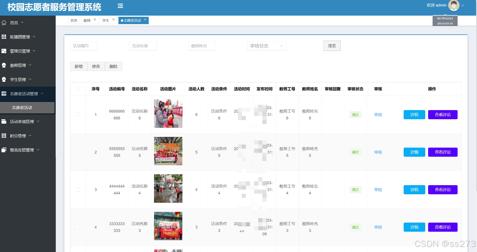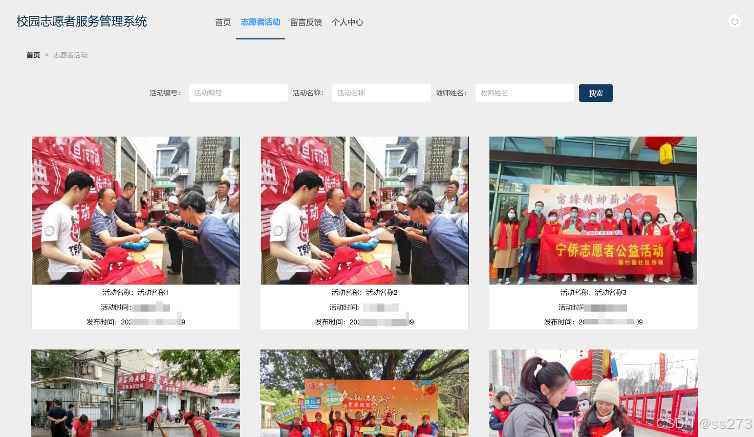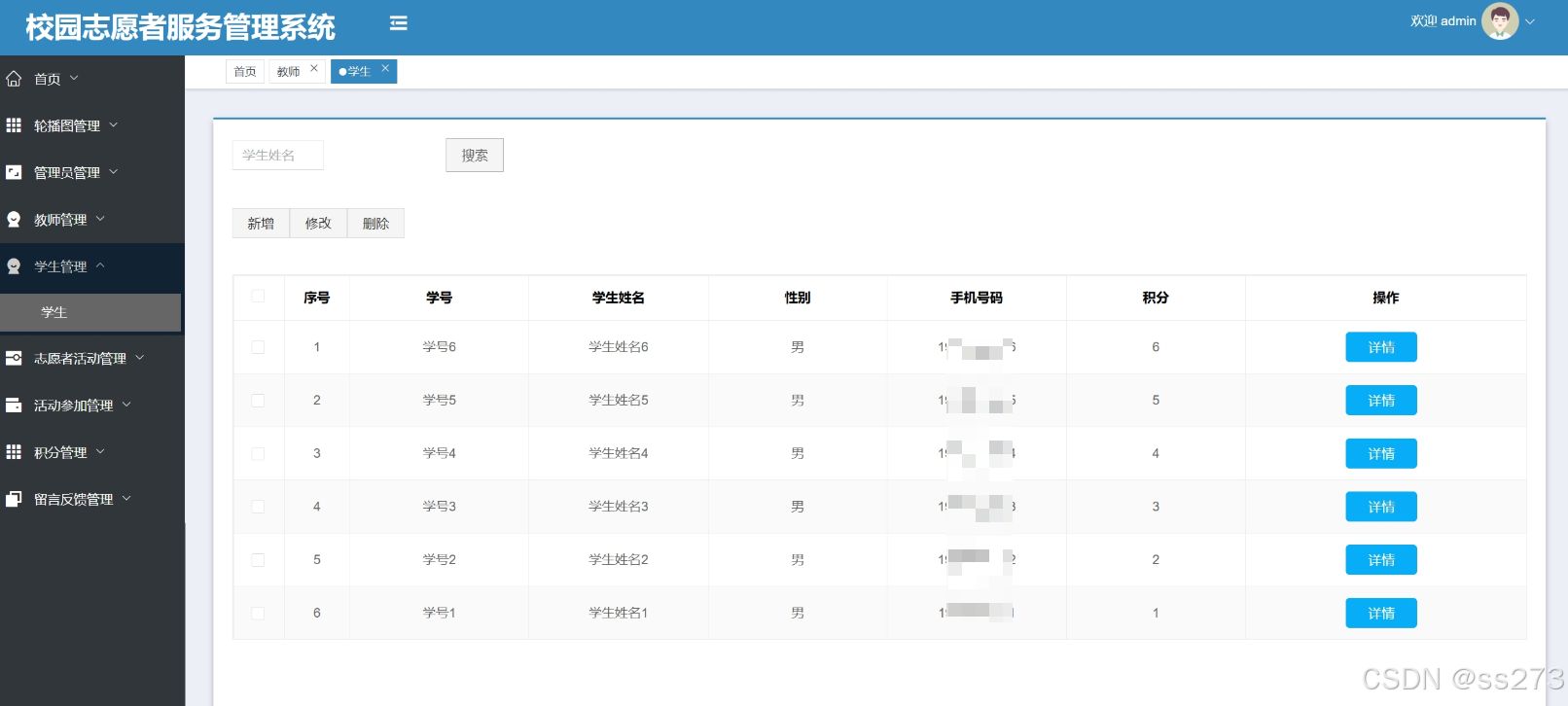 管理员:登录、轮播图管理、管理员管理、教师管理、学生管理、志愿者活动管理、活动参加管理、积分管理、留言反馈管理等。