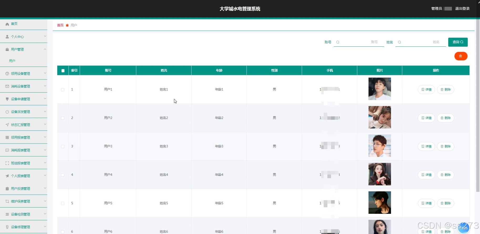 管理员角色:个人中心、用户管理、领用设备管理、消耗设备管理、设备申请管理、设备派发管理、状态汇报管理、领用报表管理、消耗报表管理、班组报表管理、个人报表管理、用户反馈管理、维护保养管理、设备检测管理、设备维修管理、报修信息管理、定期修复管理、修理计划管理。