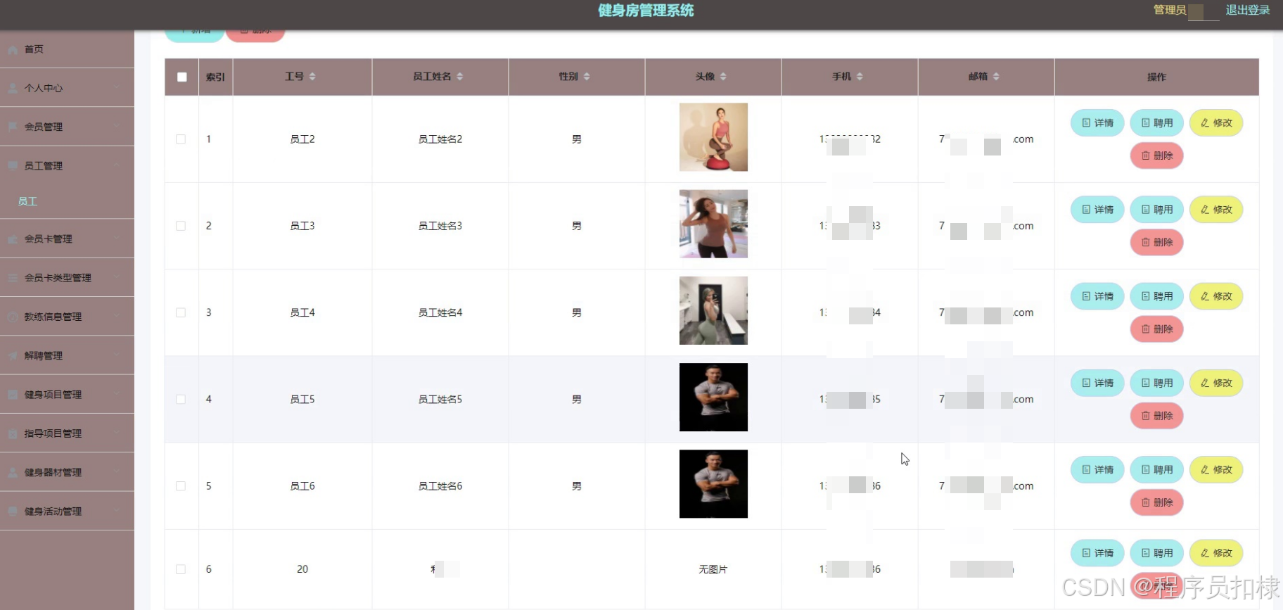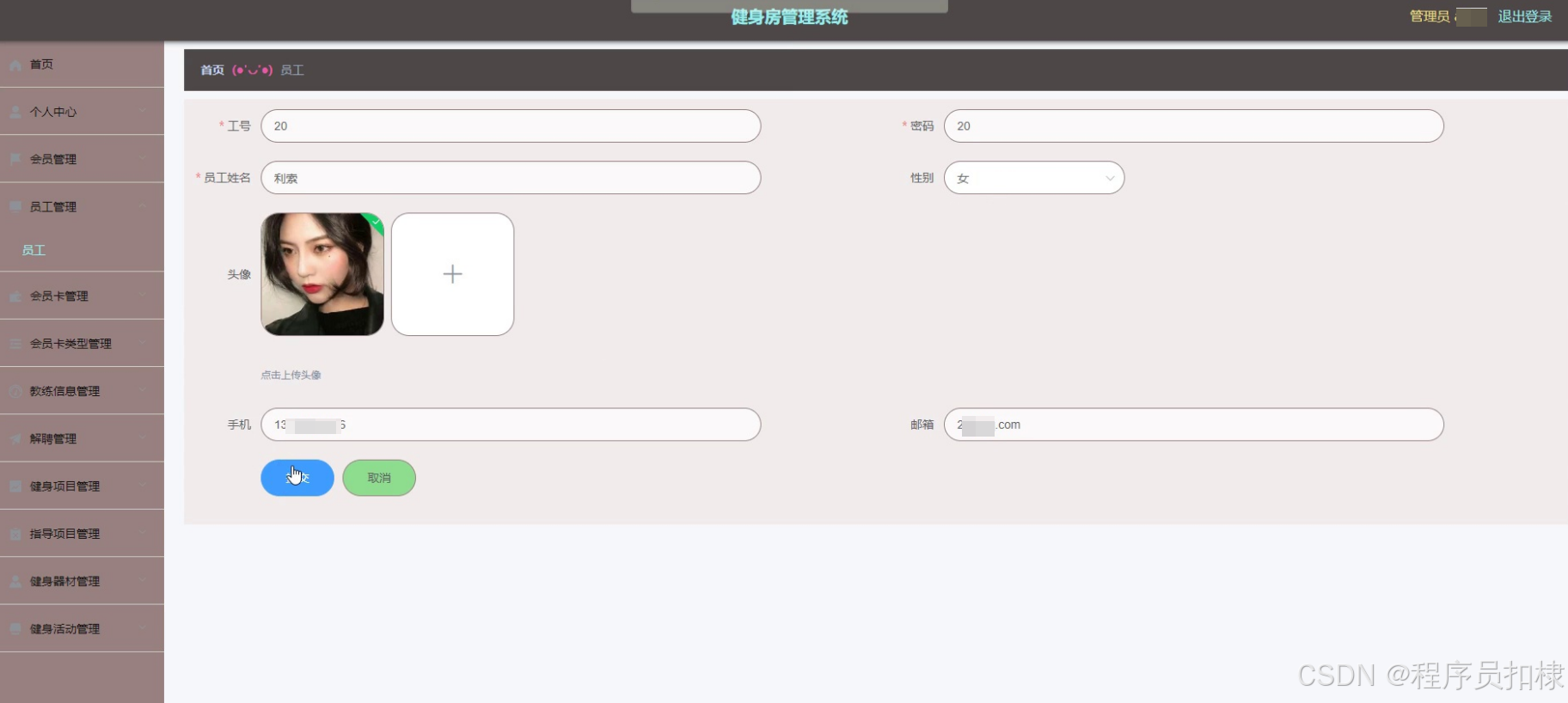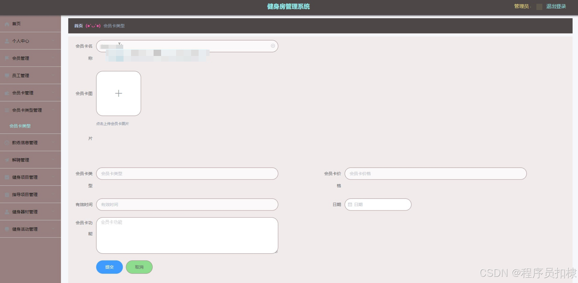 员工角色:个人中心、会员卡管理、教练信息管理、健身项目管理、健身器材管理、健身活动管理。