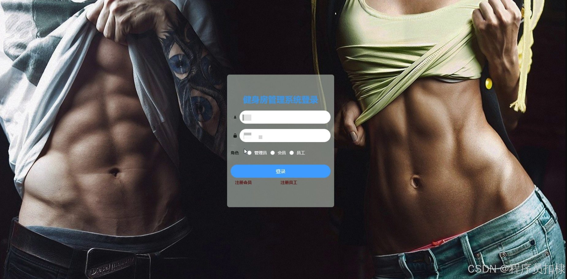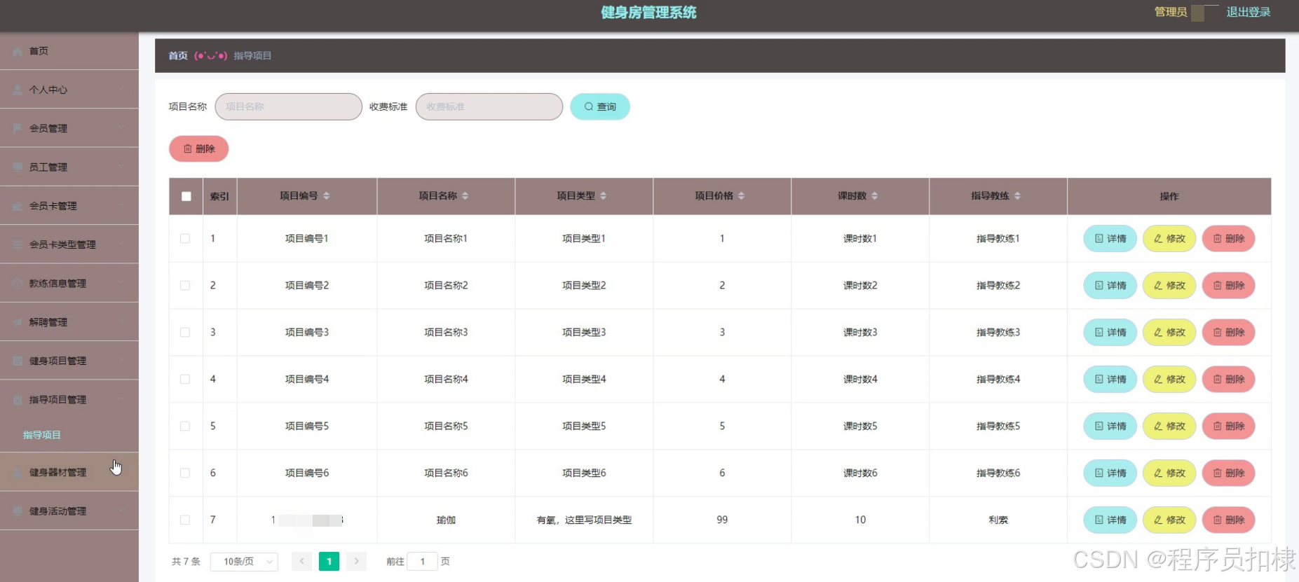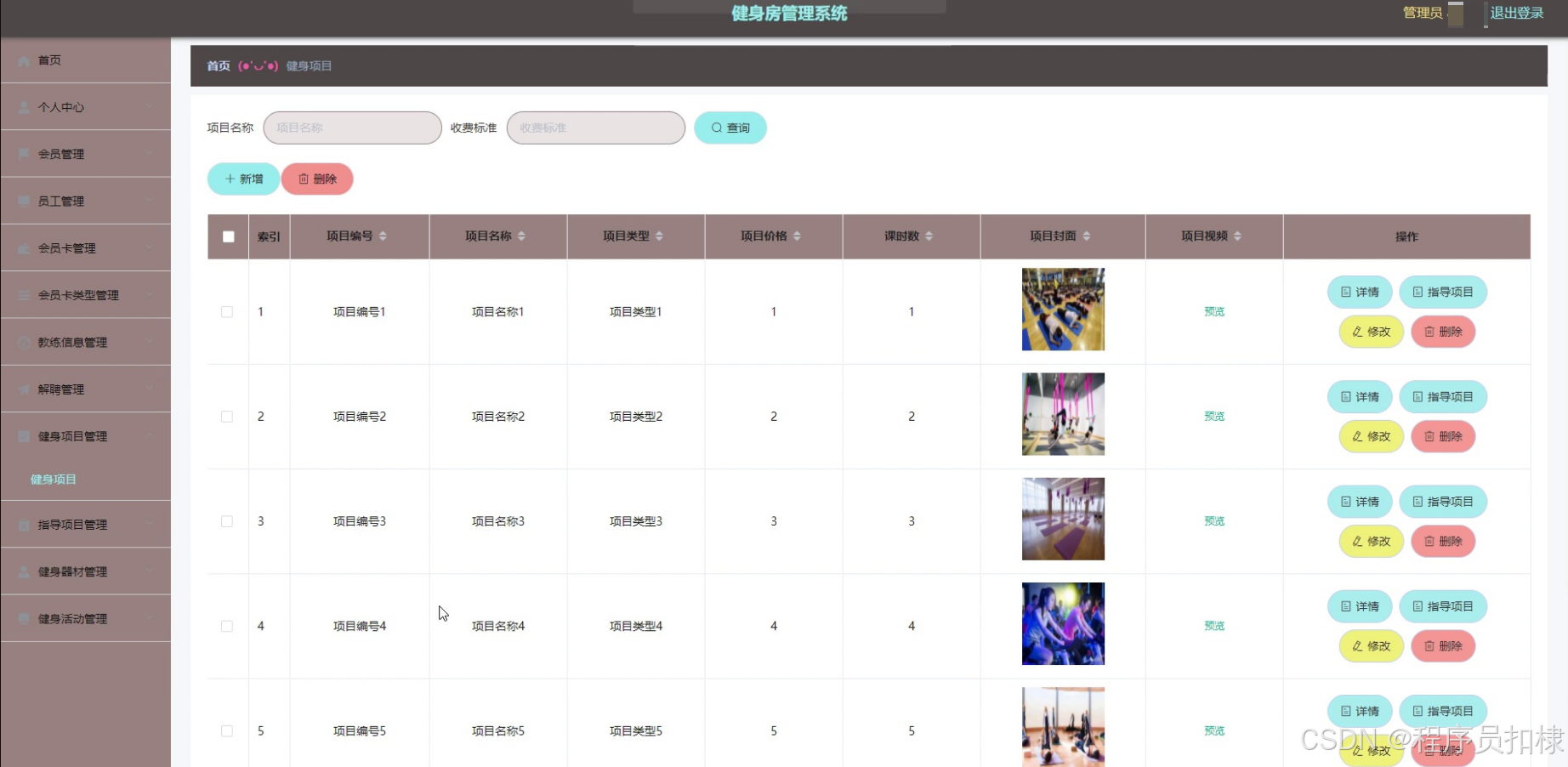 员工角色:个人中心、会员卡管理、教练信息管理、健身项目管理、健身器材管理、健身活动管理。