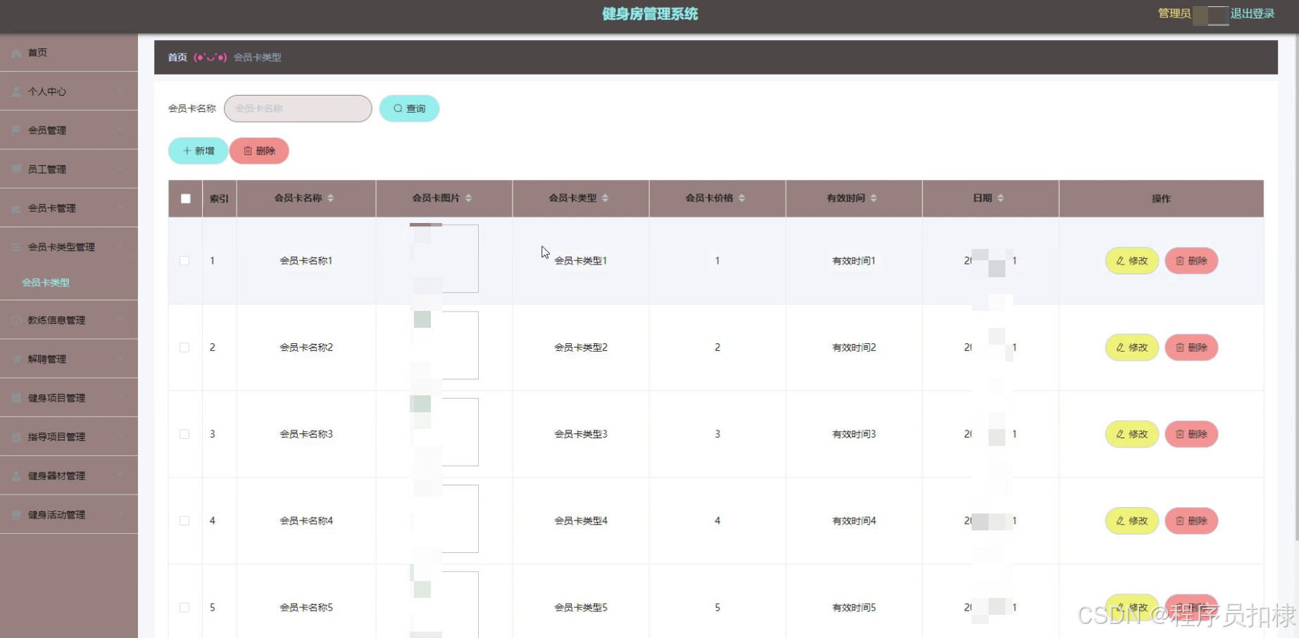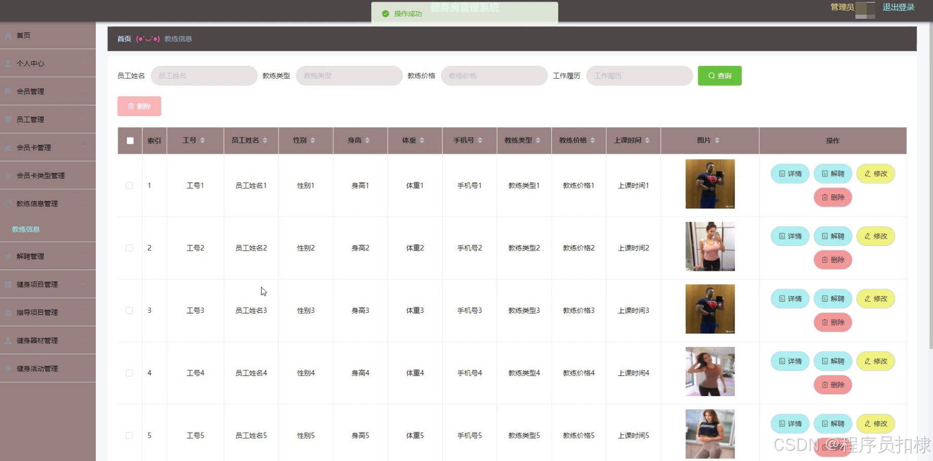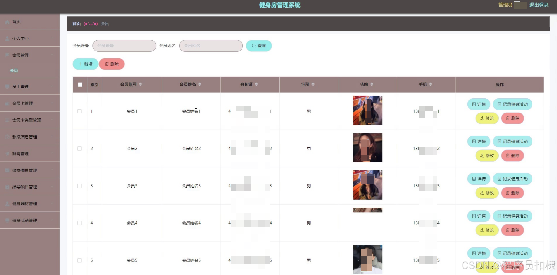 管理员角色:个人中心、会员管理、员工管理、会员卡管理、会员卡类型管理、教练信息管理、解聘管理、健身项目管理、指导项目管理、健身器材管理、健身活动管理。
