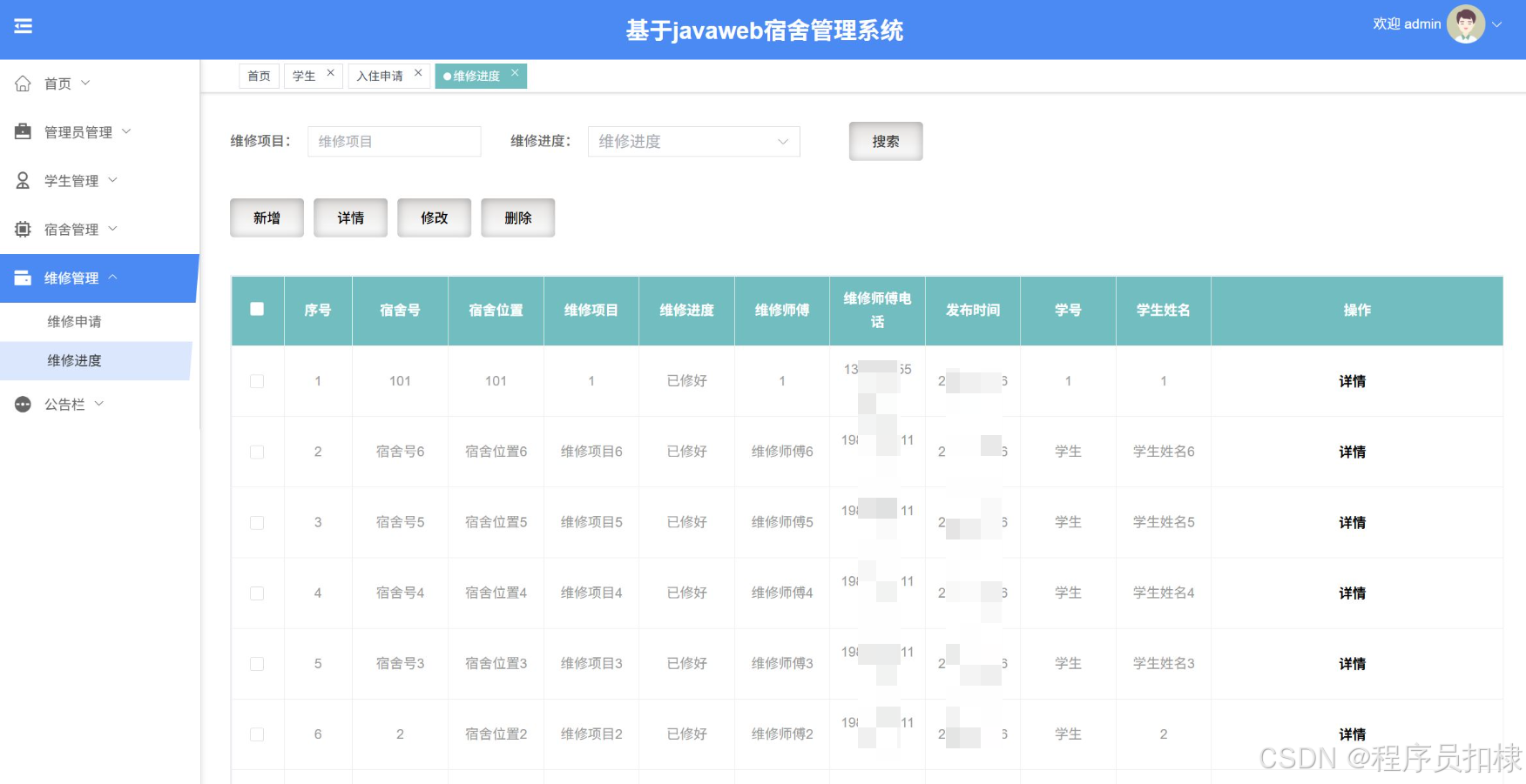 维修进度查看:学生可以查看维修进度,包括维修项目、维修进度、维修师傅、维修详情等。
