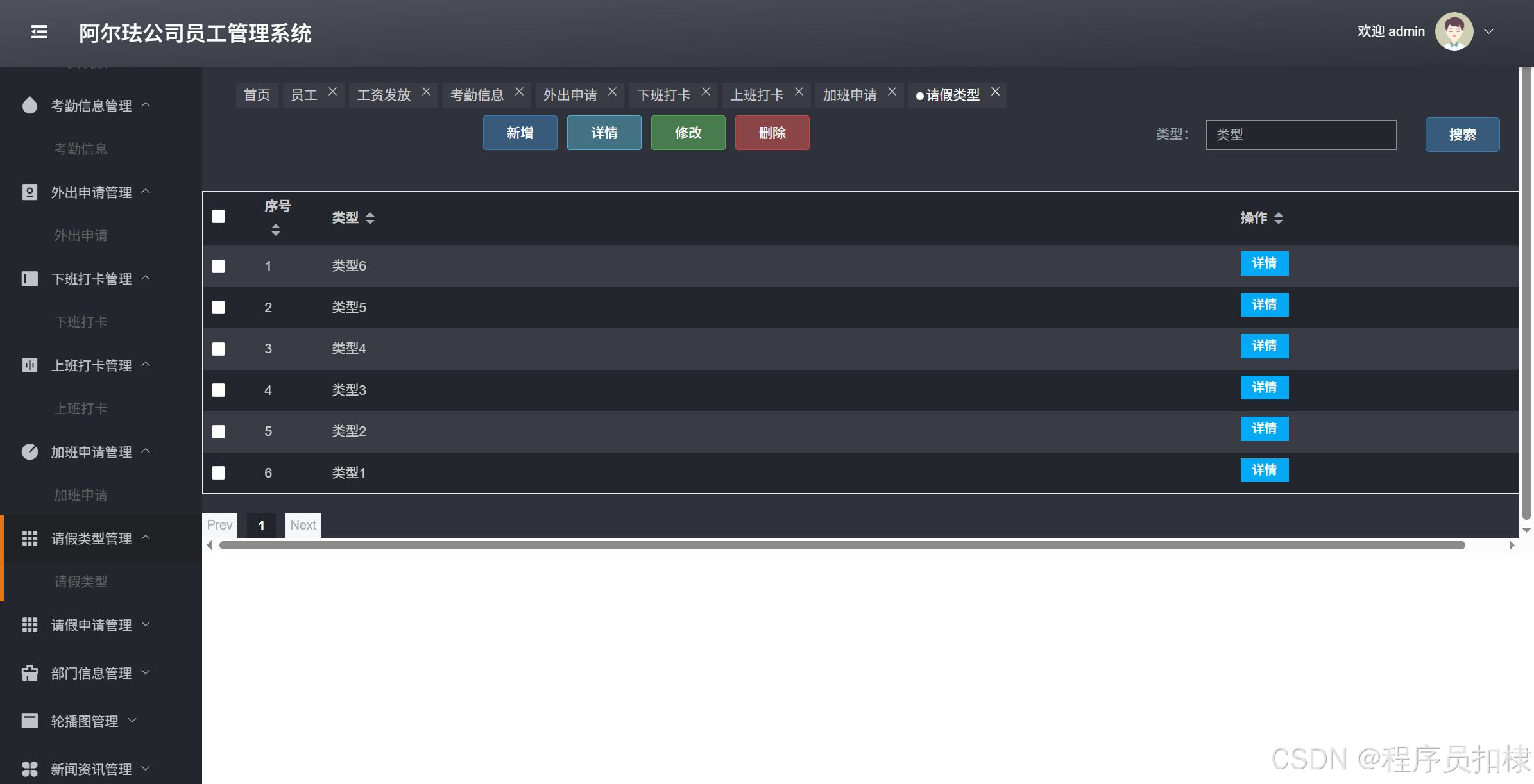 请假类型管理:管理请假类型,包括新增、查看、修改、删除请假类型。