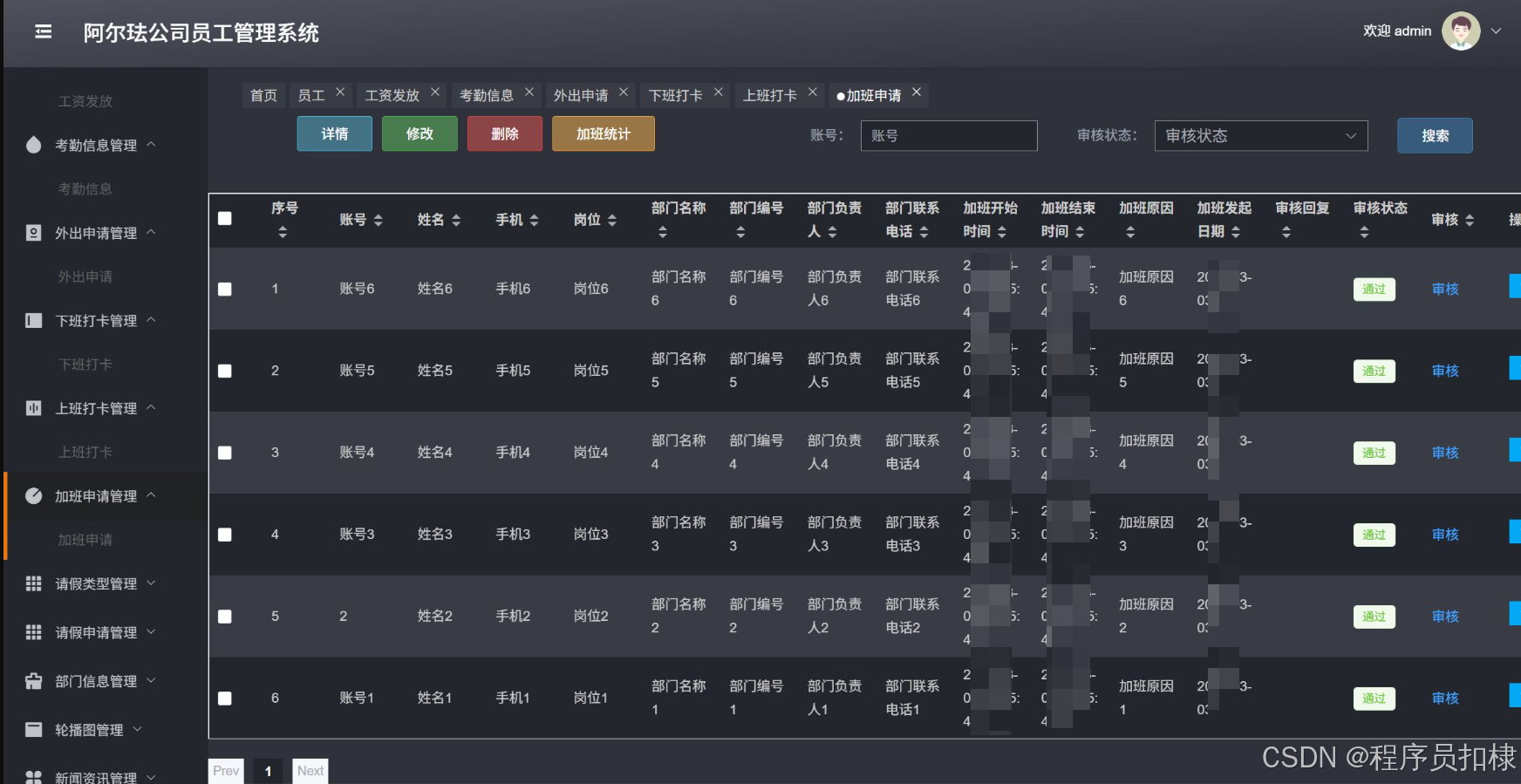 加班申请管理:管理员工的加班申请,包括查看、修改、删除、审核加班申请,并进行加班统计。
