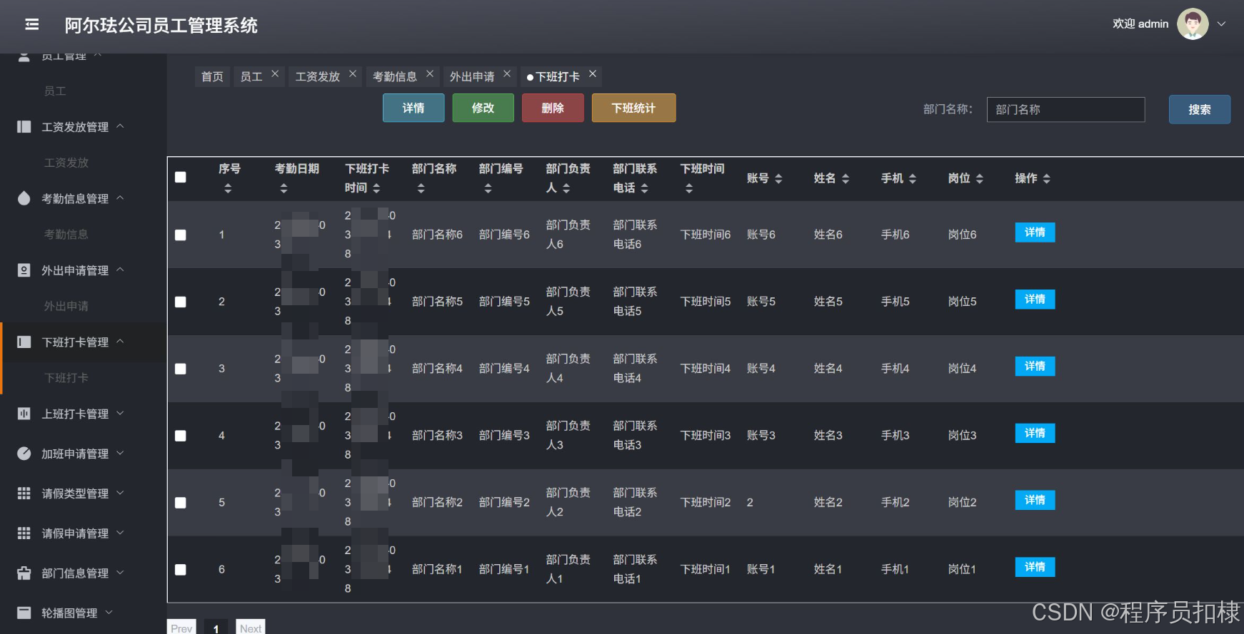 下班打卡管理:管理员工的下班打卡记录,包括查看、修改、删除下班打卡信息,并进行下班统计。
