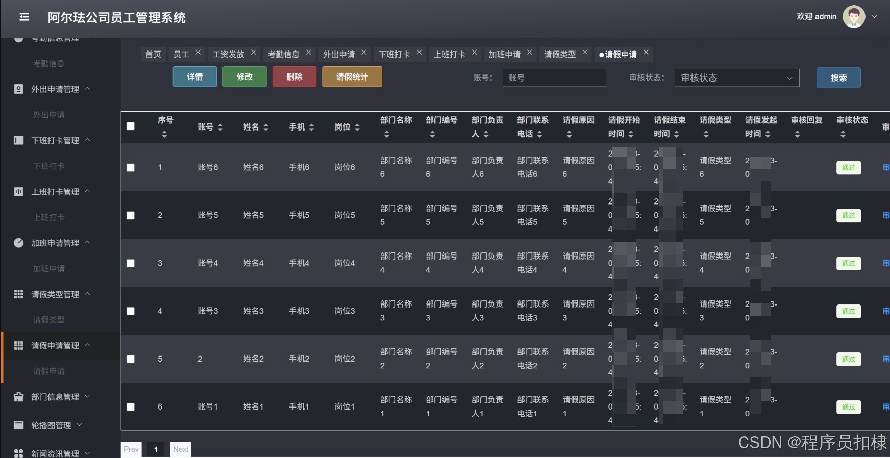 请假申请管理:管理员工的请假申请,包括查看、修改、删除、审核请假申请,并进行请假统计。