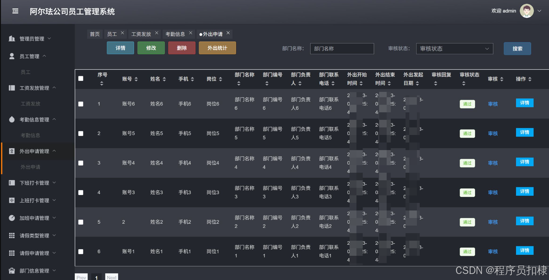 外出申请管理:管理员工的外出申请,包括查看、修改、删除、审核外出申请,并进行外出统计。