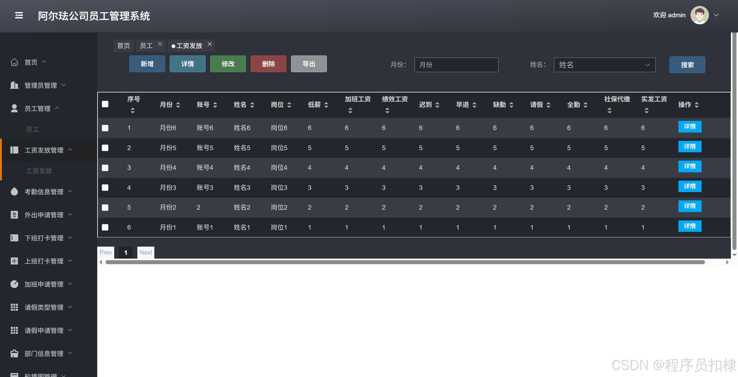 工资发放管理:管理员工的工资发放信息,包括查看、修改、删除、导出和导入工资数据。