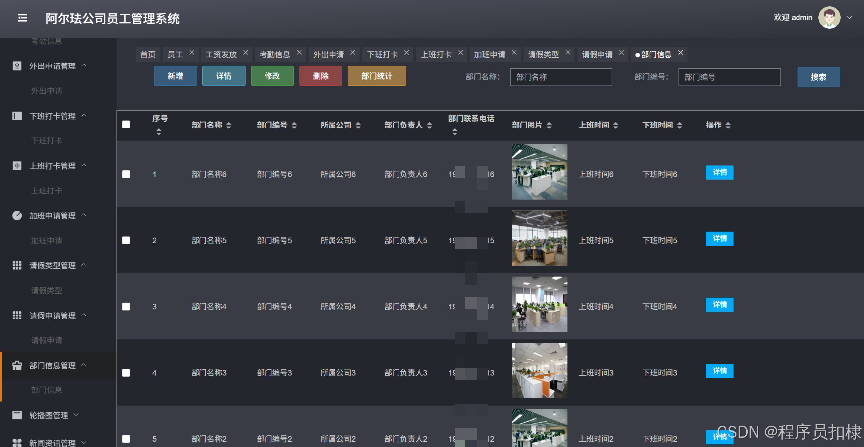 部门信息管理:查看部门信息,并进行上班打卡、下班打卡、请假、加班、外出等操作。