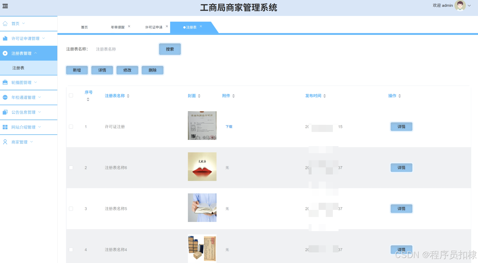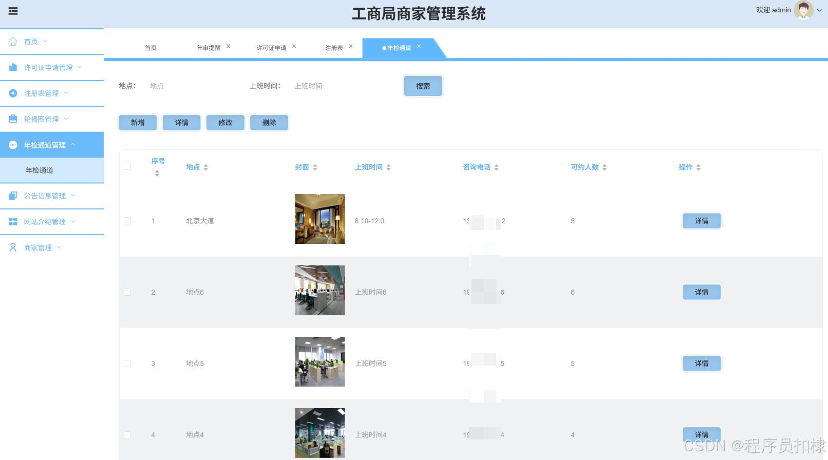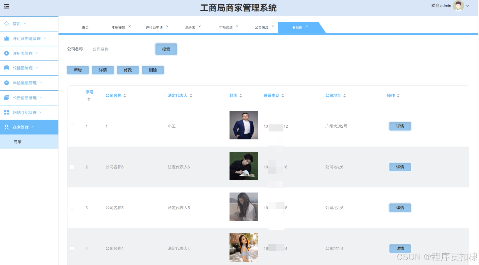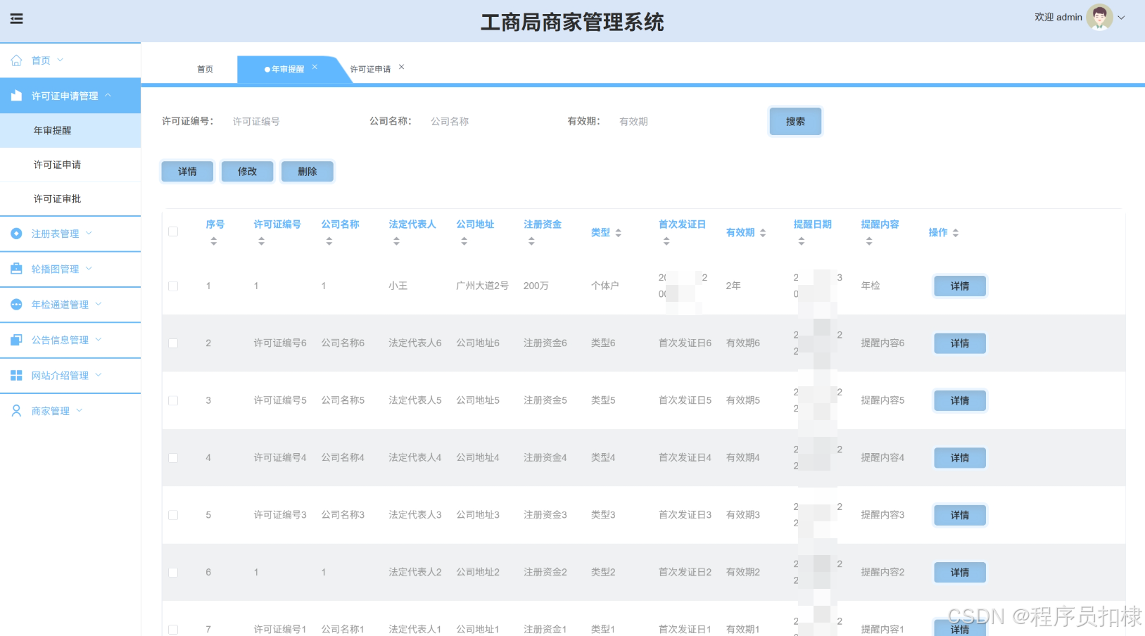 许可证申请管理:管理商家的许可证申请,包括搜索、修改或删除许可证申请。