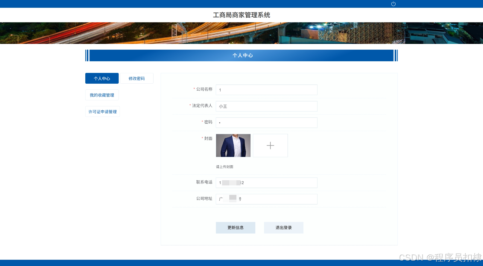 个人信息管理:商家可以更新个人详细信息,还可以对修改密码、我的收藏管理、许可证申请管理进行详细操作。
