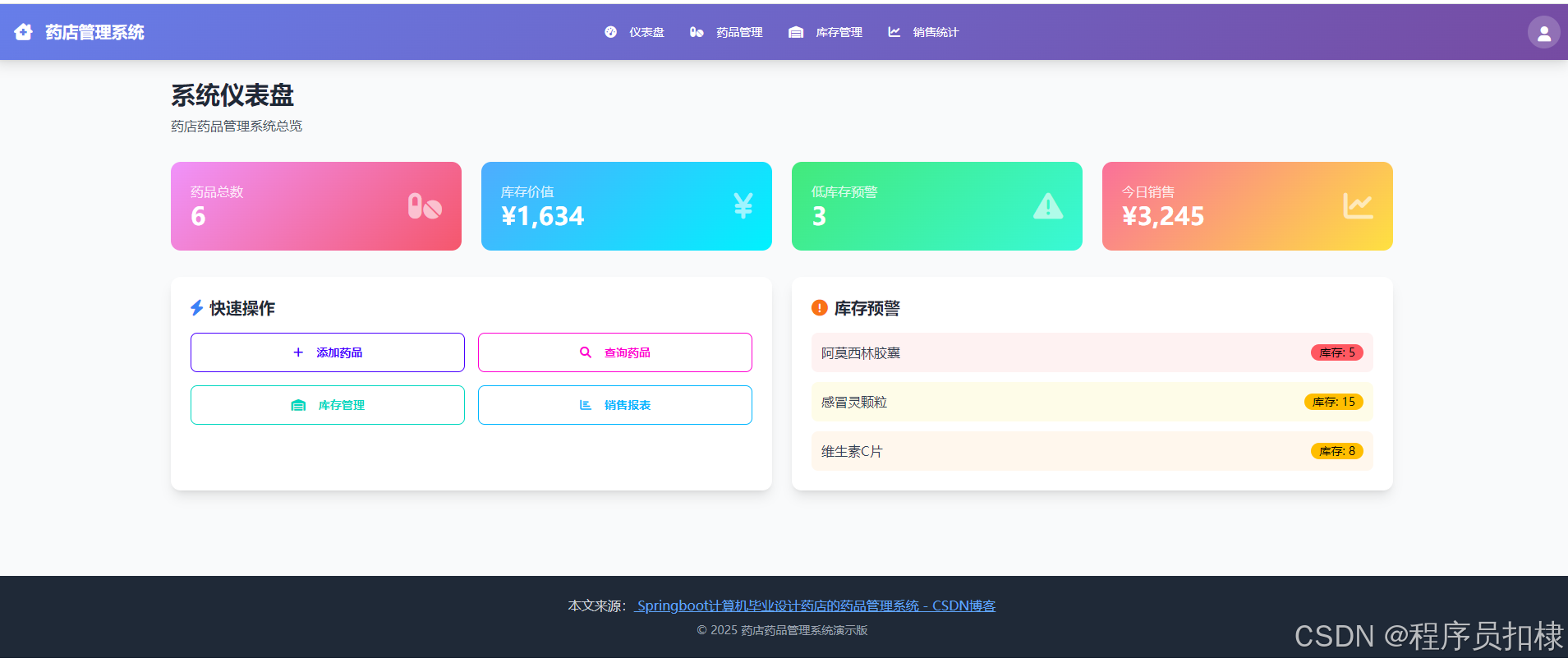 药店药品管理系统是一款功能全面、设计现代的管理工具,能够帮助药店提高运营效率、优化库存管理、提升销售分析能力。系统采用了先进的前端技术,具有良好的扩展性和可维护性,是药店数字化转型的理想选择。