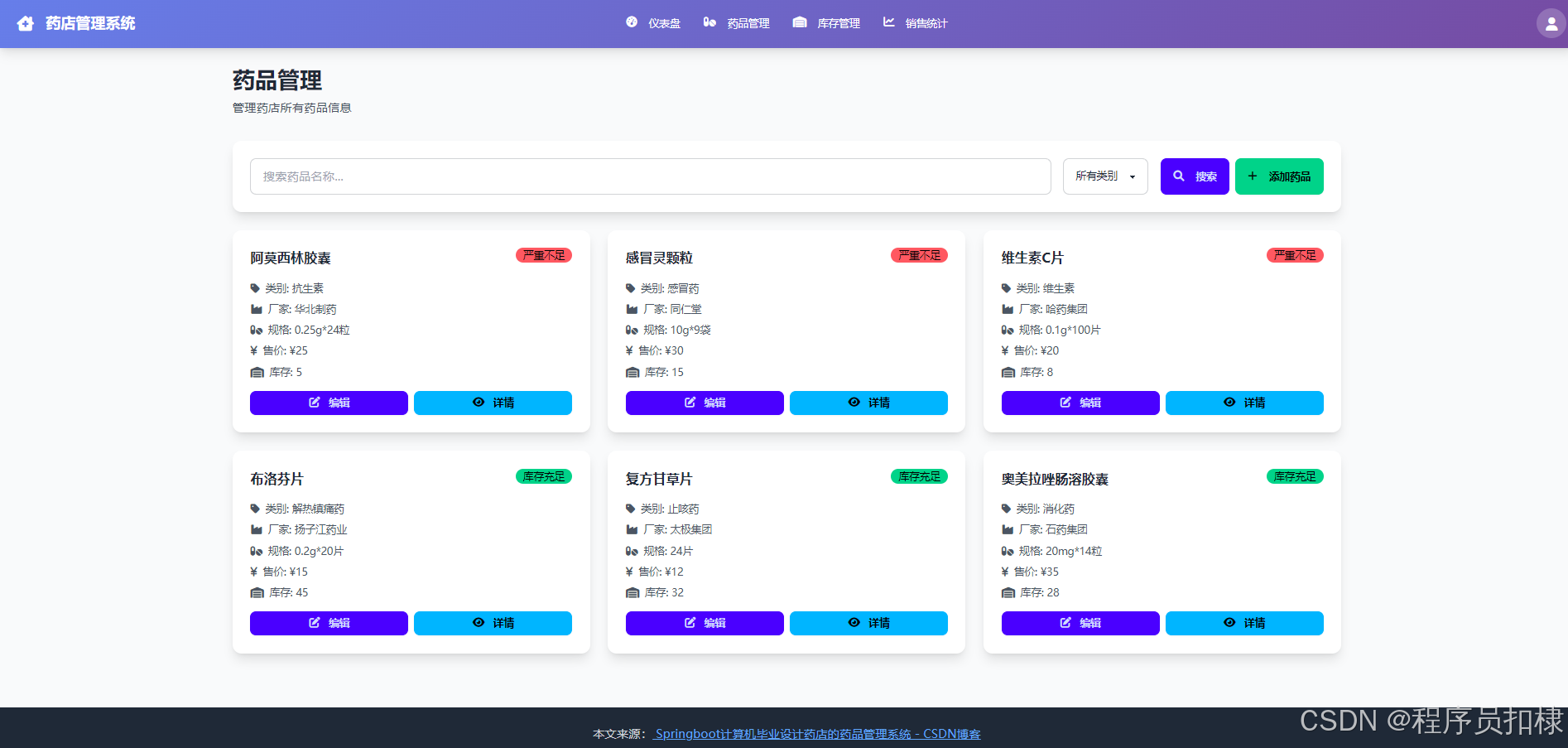 - 药品列表:以卡片形式展示所有药品信息,包括名称、类别、厂家、规格、售价和库存状态