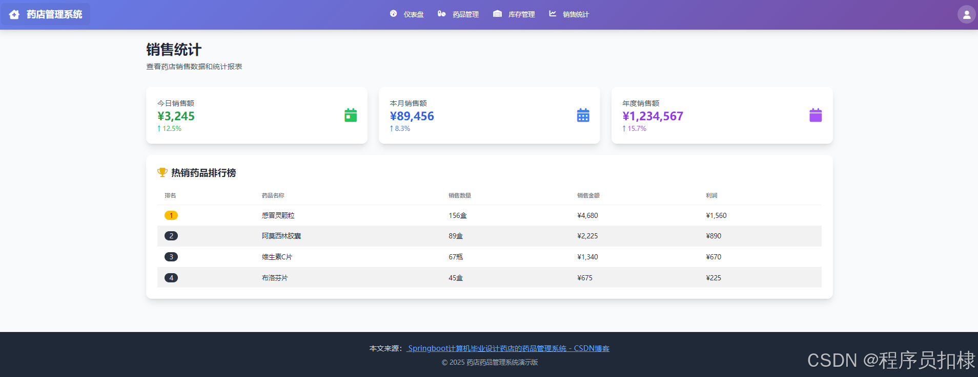 - 热销药品排行榜:按销售数量排序,展示排名前几的药品,包括销售数量、销售金额和利润