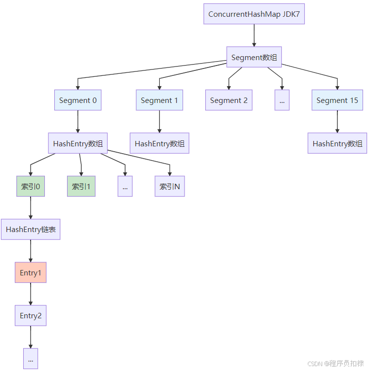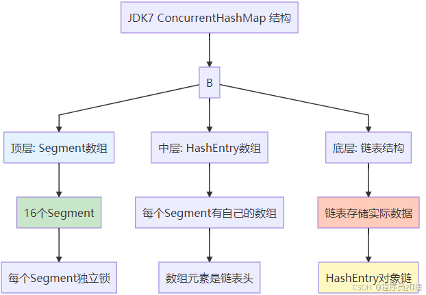 JDK 1.7中的ConcurrentHashMap采用了经典的"分段锁"设计。这种设计的思想很巧妙:将整个哈希表分成多个独立的段(Segment),每个段都有自己的锁,从而减少线程竞争。