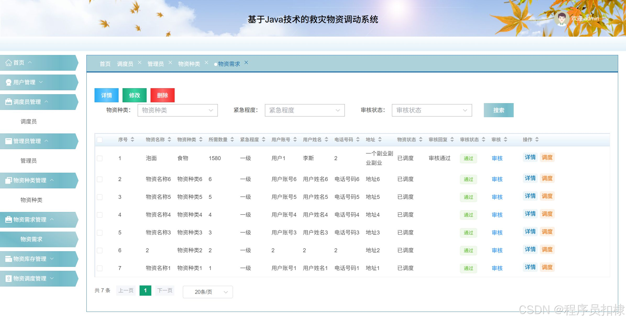 物资需求管理:管理物资需求的信息,包括查看、修改、删除、审核和调度。