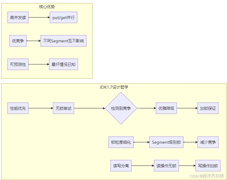 这种设计在保证线程安全的前提下,最大限度地提高了并发性能,是并发编程中"读多写少"场景的优秀实践。虽然JDK1.8已经采用了更新的实现,但理解这些经典设计思想,对于深入掌握并发编程仍然具有重要价值。