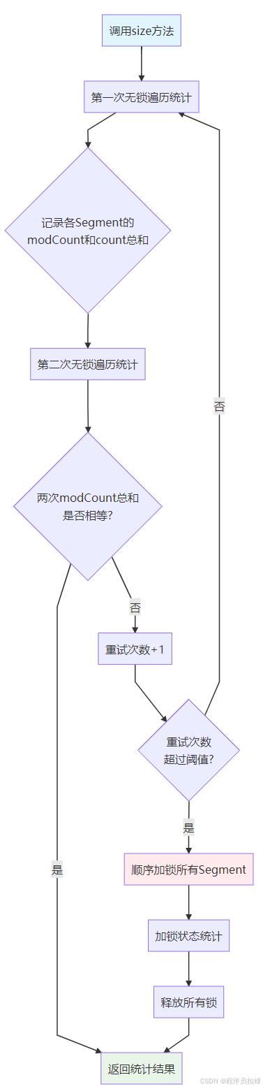 modCount的作用: 每个Segment维护一个modCount,每次修改操作(put、remove等)都会增加这个值。通过比较两次统计的modCount总和,可以判断在统计期间是否有并发修改发生。