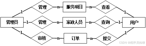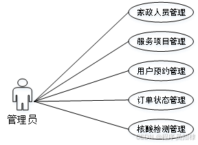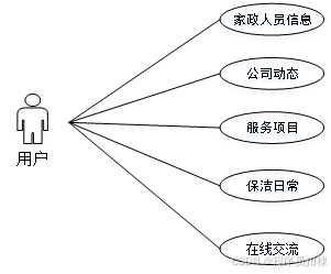 (3)确定好系统使用的技术,进行在线确认系统所划分的用户角色,并且根据用户角色划分确定所要设计的功能模块,对家政服务平台的设计主要划分别为管理员和用户角色,并所使用的功能模块也相应不同,但是系统的数据库实现的内容是交互的,用户可以随时根据自己的需求进行课程信息,对于系统工作人员可以根据自己的分管内容进行在线信息的处理及操作,管理员获取到所有用户的详细数据信息,并根据需求进行第一时间处理解决。
