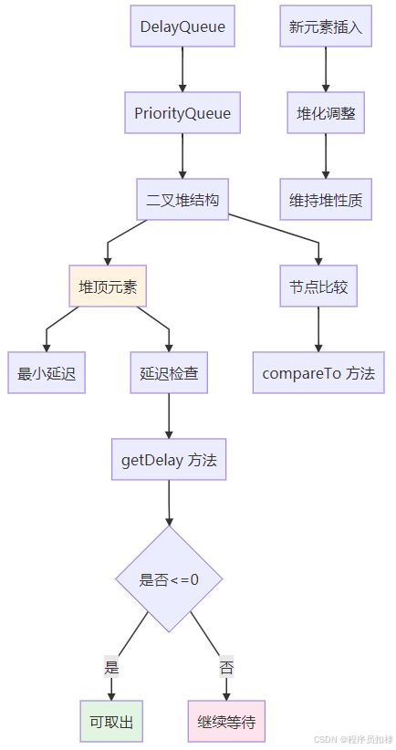 数据结构揭秘:DelayQueue内部使用PriorityQueue(优先级队列)存储元素。这个优先级队列维护一个小顶堆(min-heap),堆顶始终是延迟最小的元素。当新元素加入时,compareTo方法决定了它在堆中的位置;当延迟到期时,堆顶元素会被首先取出。