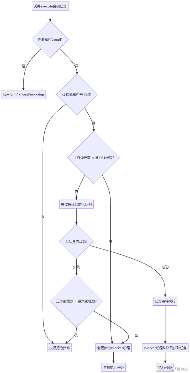 结合线程池状态管理、队列管理和拒绝策略,一个完整的execute方法实现如下: