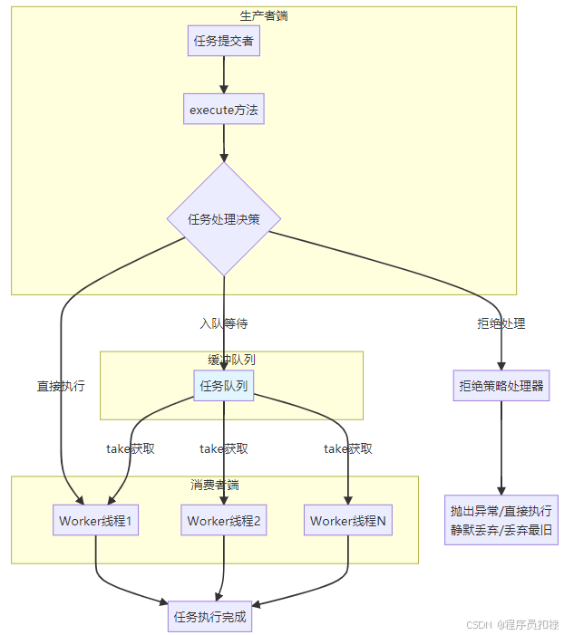 在线程池的架构中,execute(Runnable command)方法是整个系统对外的唯一任务提交入口。这个看似简单的方法背后,蕴含了生产者-消费者模式、资源管理、流量控制等多重设计思想。理解execute方法的实现,是掌握线程池工作原理的关键。