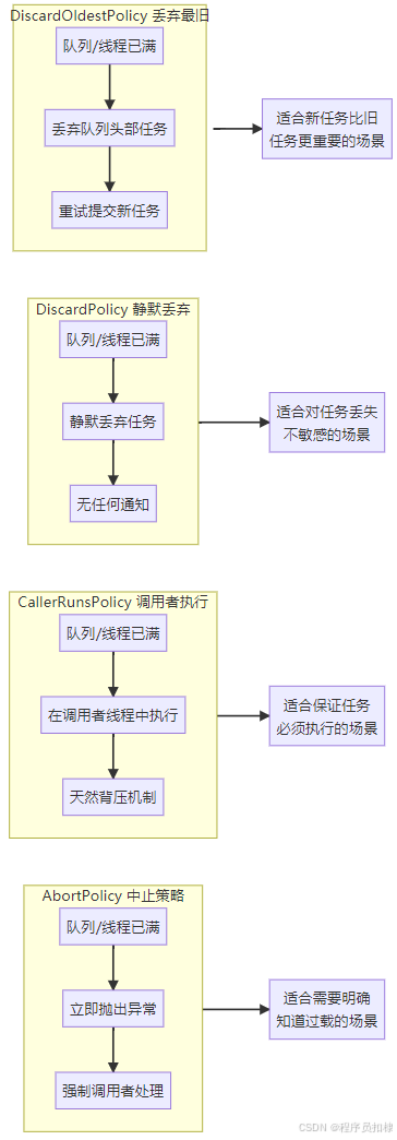 特点:丢弃队列中最老的任务,为新任务腾出空间 适用场景:新任务比旧任务更重要的场景(如实时数据处理)