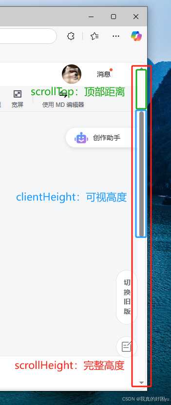 完整的一整根滚动框就是我们的scrollHeight,相当于是整个页面的高度。