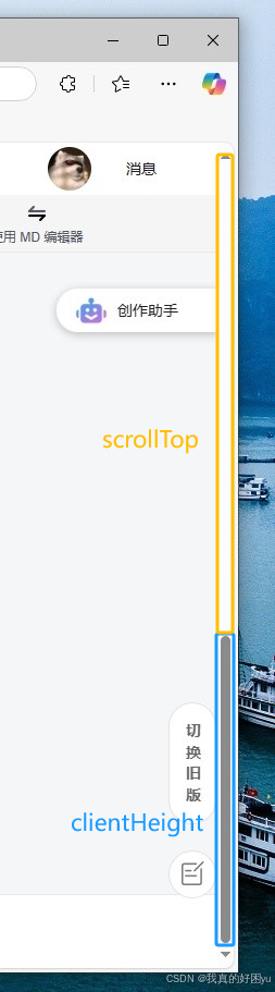 并获取他的三个高度属性:scrollTop,scrollHeight,clientHeight(如果不理解属性含义可以去文章开题查看)